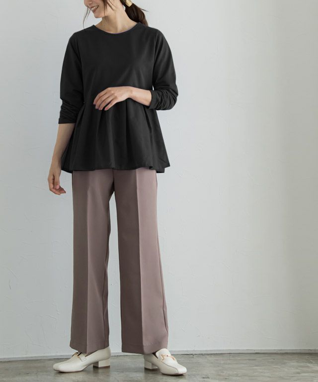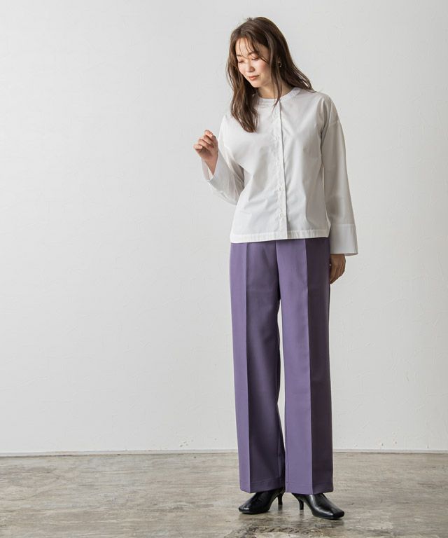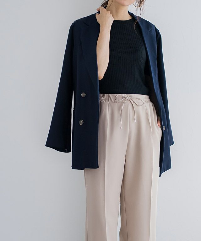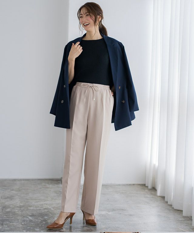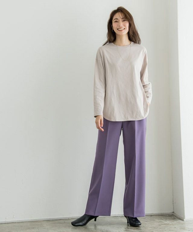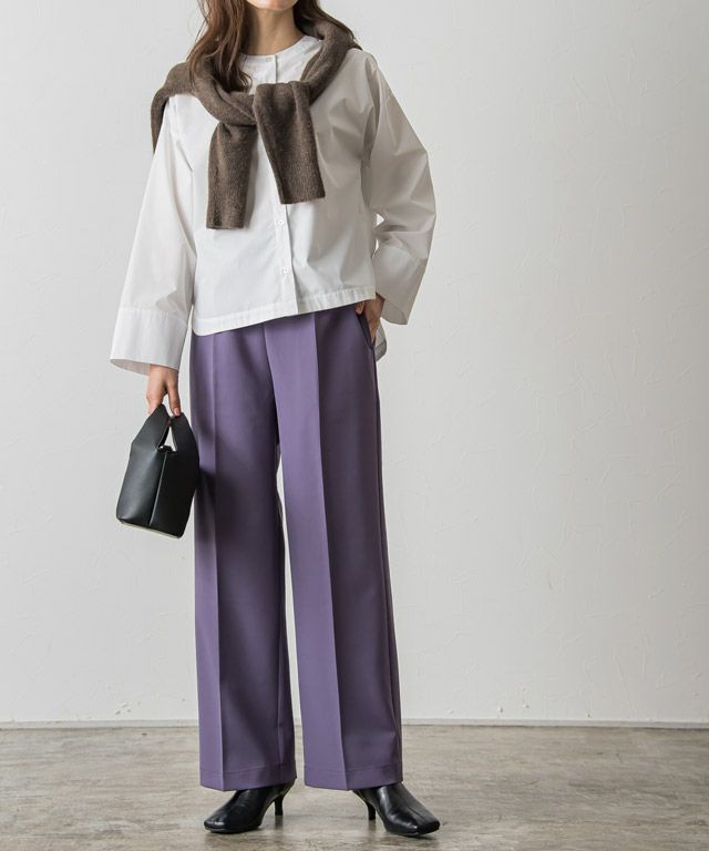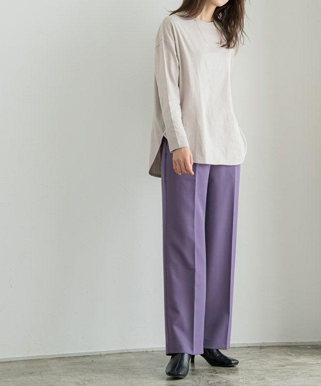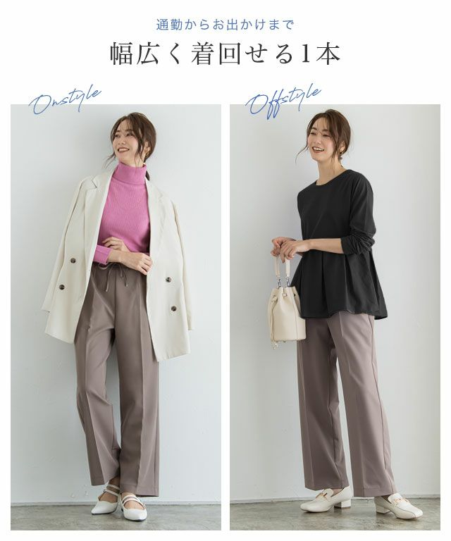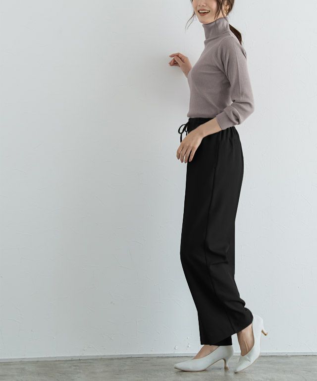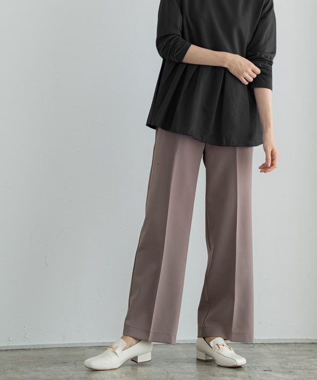 程よい厚みで高見えするのに、伸縮性があり楽な穿き心地のストレッチ素材を使用。シワになりにくくお手入れも簡単です。ウエストゴム入りで窮屈感もありません◎