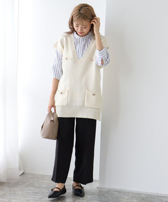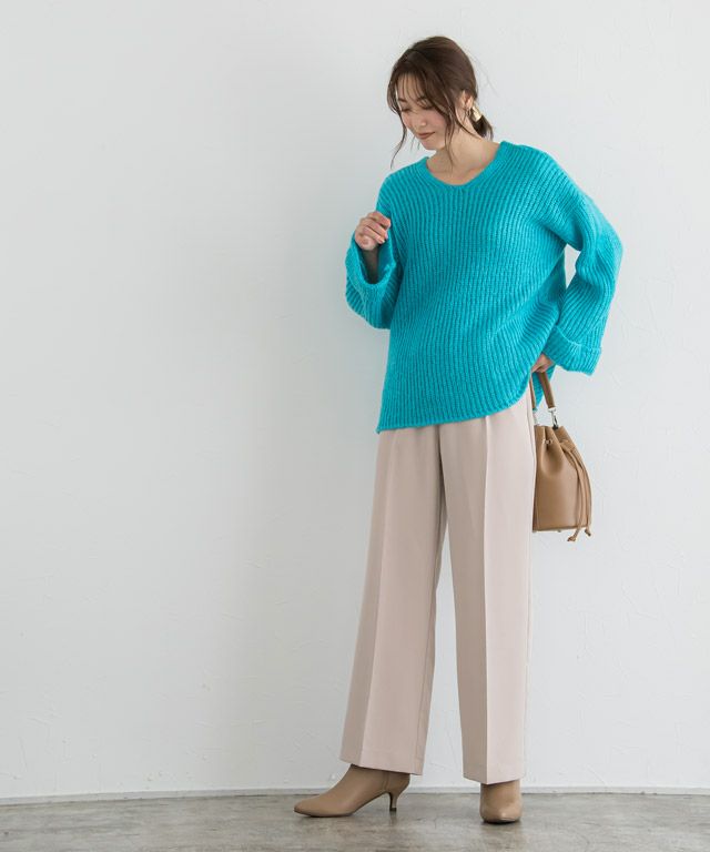 また、ニット製品は生産の過程上「生地を織る際の糸の継ぎ目」繊維の「混紡」、プレス加工、製品洗い加工によって形やサイズ(5cm前後)に誤差が生じる場合がございますが品質上の問題はございません。
