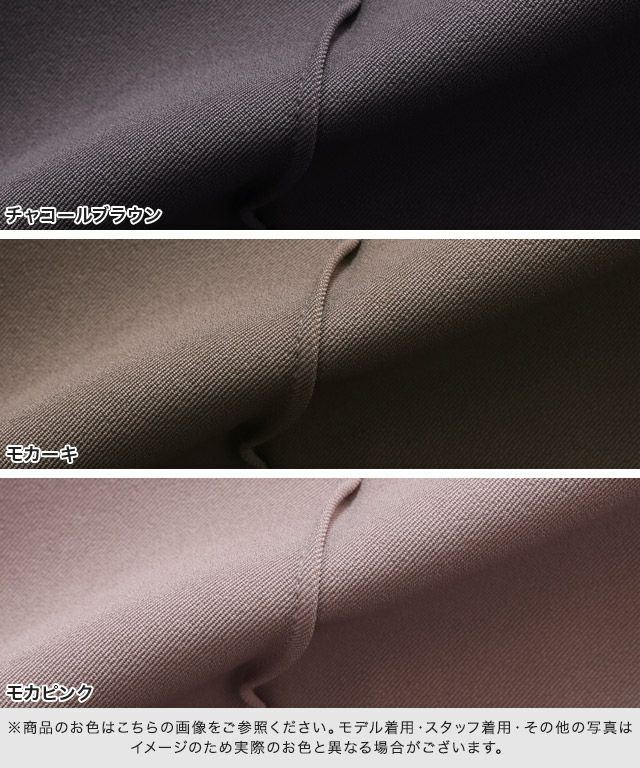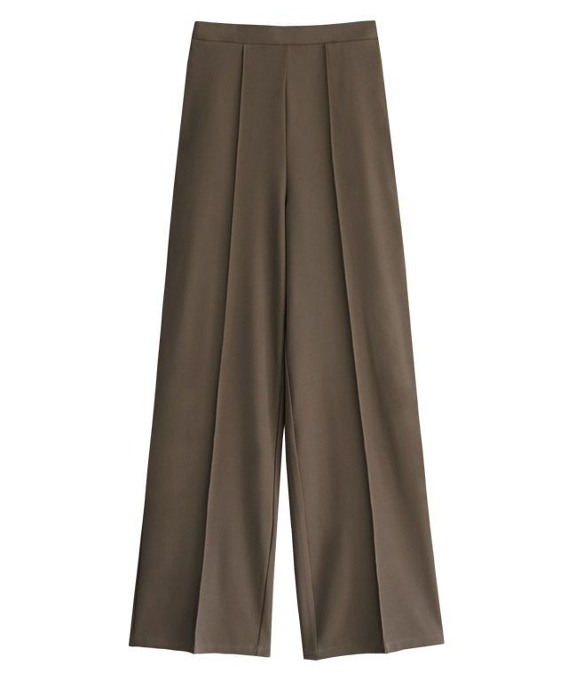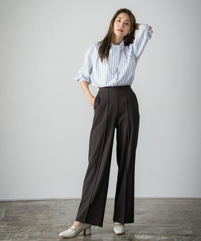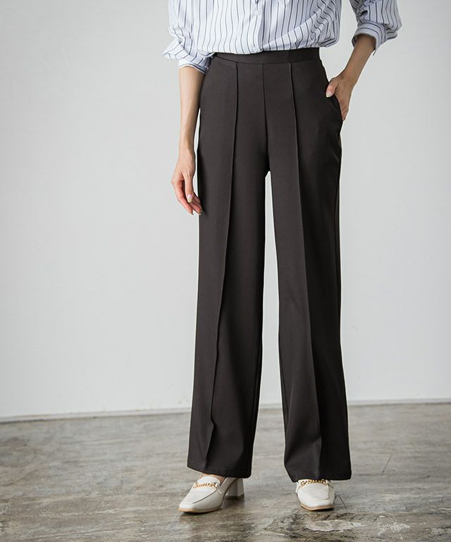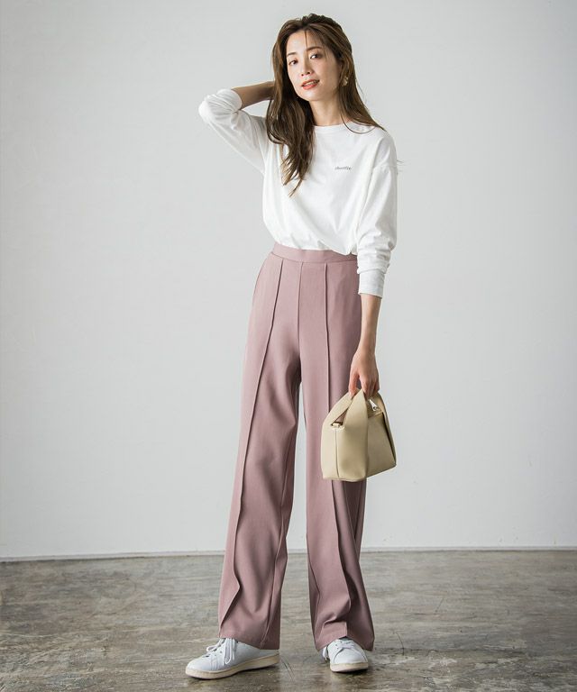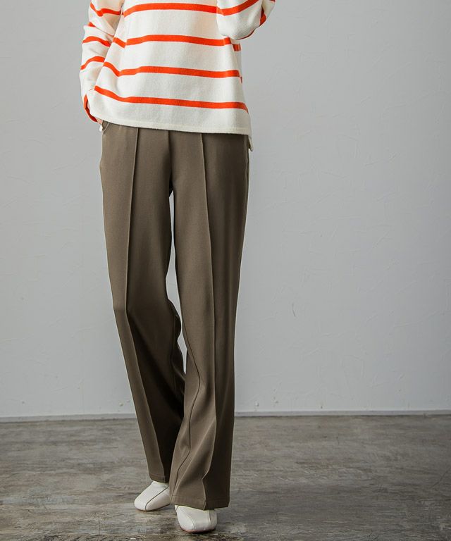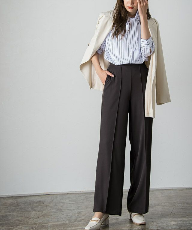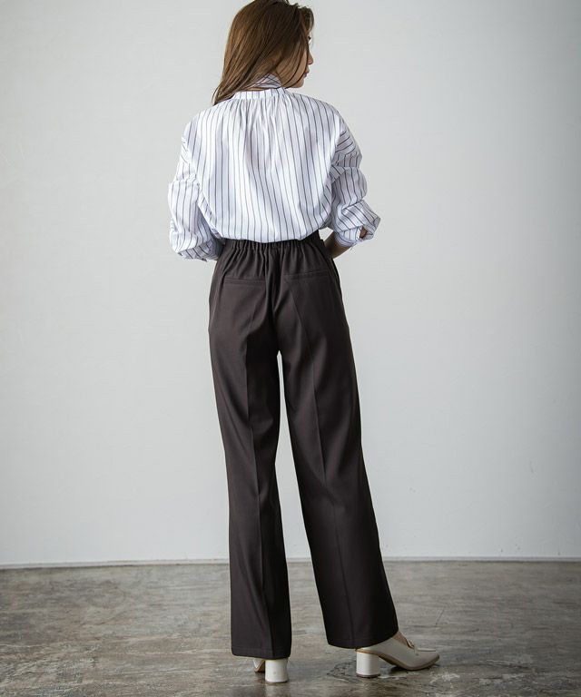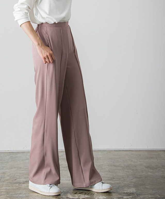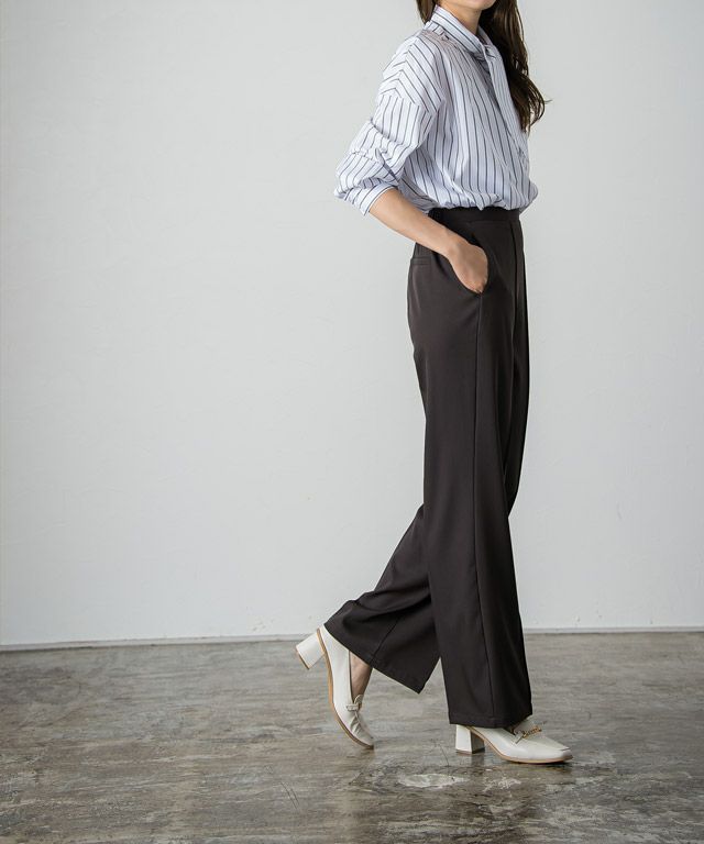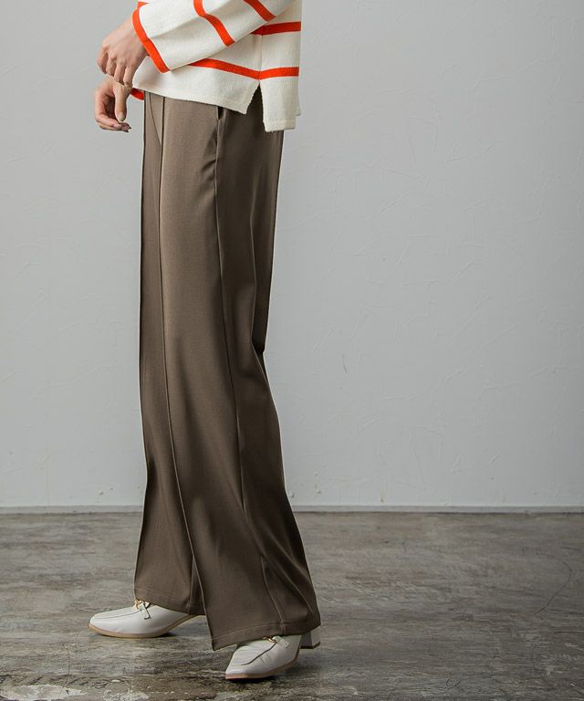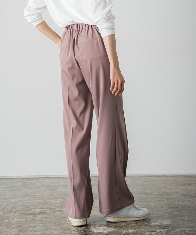 I着丈はヒールを履いても裾が床に付く丈感でした。ウエストはちょうどで、太もも・ヒップ周りにはゆとりがあります。さらっとした肌触りで落ち感のある素材です。