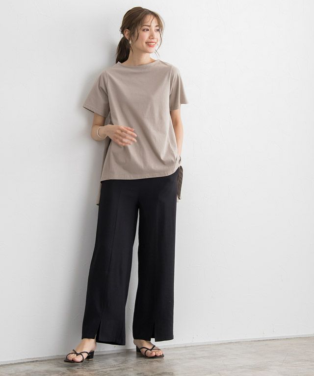 ストレートなシルエットに裾のスリットが、スタイリングに抜け感とアクセントをプラスしてくれる一枚。脚のラインを拾いにくいところも嬉しいポイント。同素材のジレとのセットアップ着用もおすすめです。