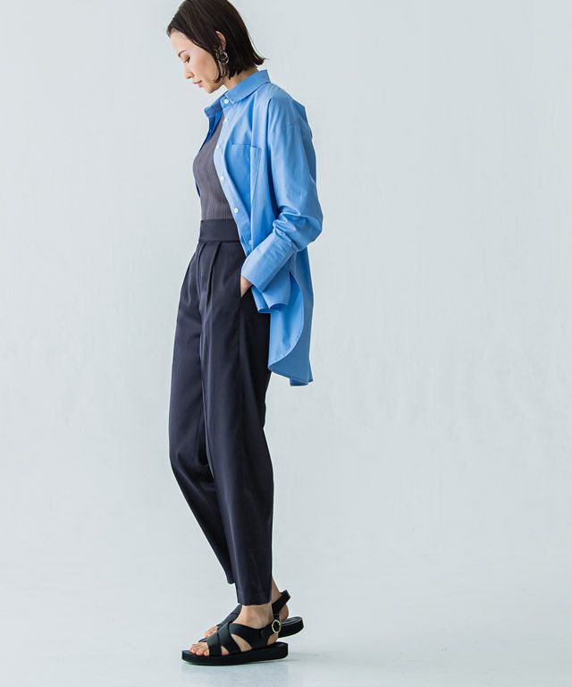 ハイウエストとタックデザインで目線を上に上げ、スタイルアップのスタイリングに導きます。緩めのテーパードシルエットでキレイめな印象ながら程良く抜け感のあるデザイン。シンプルなトップスと合わせるだけで華やかさをプラスしてくれるアイテムです。