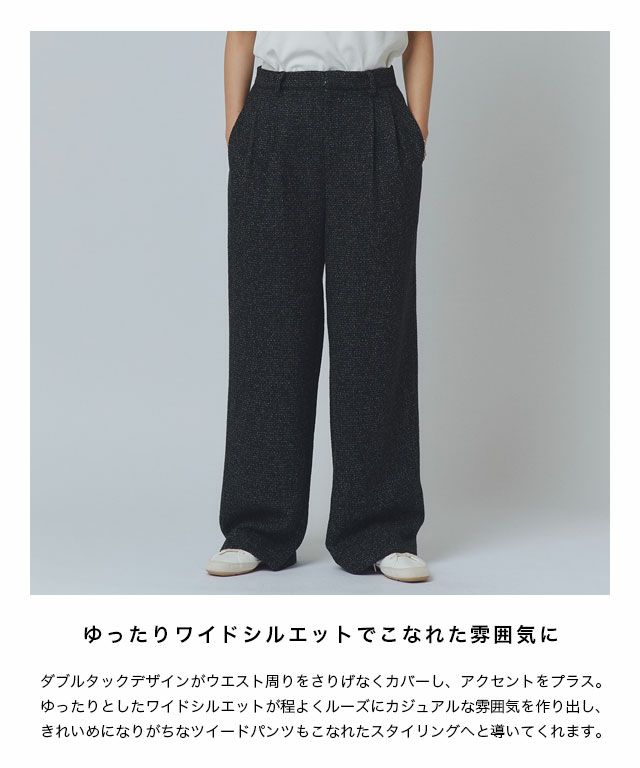 ダブルタックデザインがウエスト周りをさりげなくカバーし、アクセントをプラス。ゆったりとしたワイドシルエットが程よくルーズにカジュアルな雰囲気を作り出し、きれいめになりがちなツイードパンツもこなれたスタイリングへと導いてくれます。