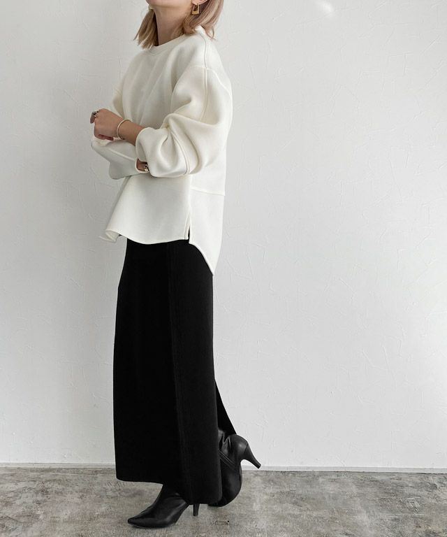 もっちりと厚みのある風合いが身体のラインを拾いにくく、綺麗なシルエットを作り出します。ウール混の温かみのある表情と、柔らかく滑らかな肌触りで着心地の良い一枚です。