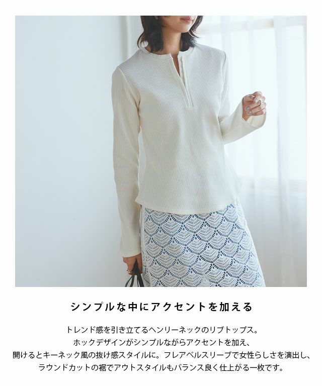 トレンドスタイルに導くヘンリーネックのリブトップス。フロントのホックデザインが、シンプルながらもアクセントをプラスしてくれるデザインです。ホックを開けてキーネック風にすることでヘルシーで抜け感のあるスタイルに。ゆったりとしたフレアベルスリーブで女性らしさを加え、裾はラウンドカットにしてアウトスタイルでもバランスよく仕上がる一枚です。