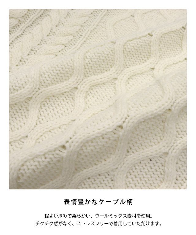 立体感のあるケーブル柄は表情豊かで、サマ見えする一枚。サイドの編みの切り替えとフロントのスリットが程よくスタイリングのアクセントに。