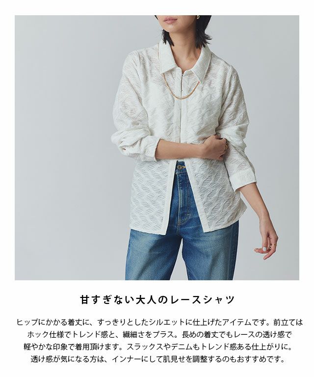 ヒップにかかる着丈に、すっきりとしたシルエットに仕上げたアイテムです。前立てはホック仕様でトレンド感と、繊細さをプラス。長めの着丈でもレースの透け感で軽やかな印象で着用頂けます。スラックスやデニムもトレンド感ある仕上がりに。透け感が気になる方は、インナーにして肌見せを調整するのもおすすめです。