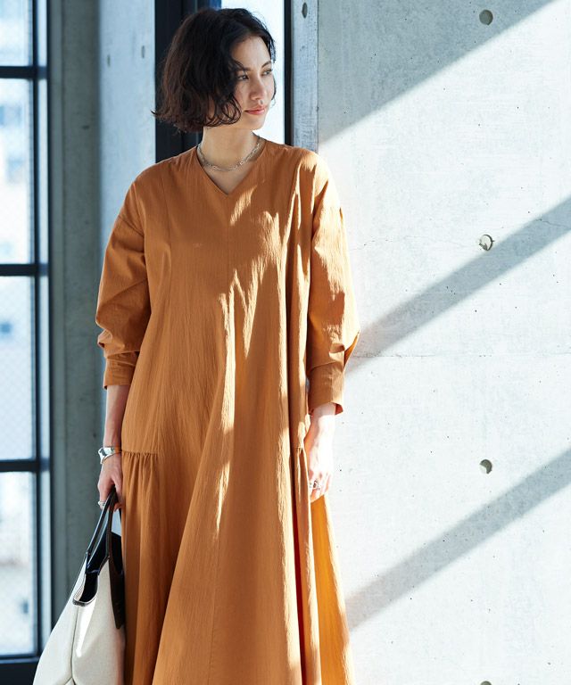 裾のギャザー切り替えが大人の女性らしいシルエットを演出するロングワンピース。袖口に向かって細くなった構築的な袖デザインがモードな印象を作り出します。すっきりとしたVネックラインで抜け感をプラス。一枚で着映える主役級ワンピースです。