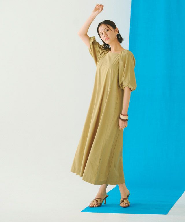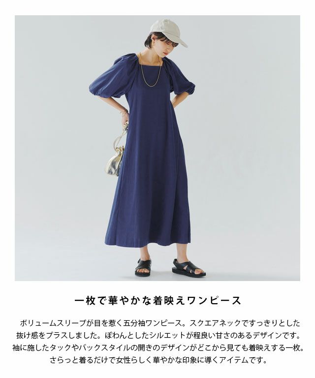 ボリュームスリーブが目を惹く五分袖ワンピース。スクエアネックですっきりとした抜け感をプラスしました。ぽわんとしたシルエットが程良い甘さのあるデザインです。袖に施したタックやバックスタイルの開きのデザインがどこから見ても着映えする一枚。さらっと着るだけで女性らしく華やかな印象に導くアイテムです。