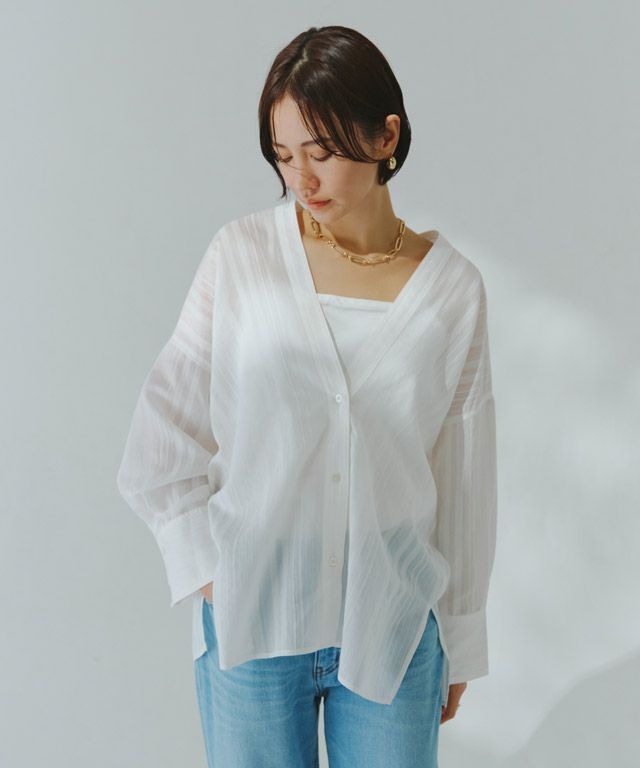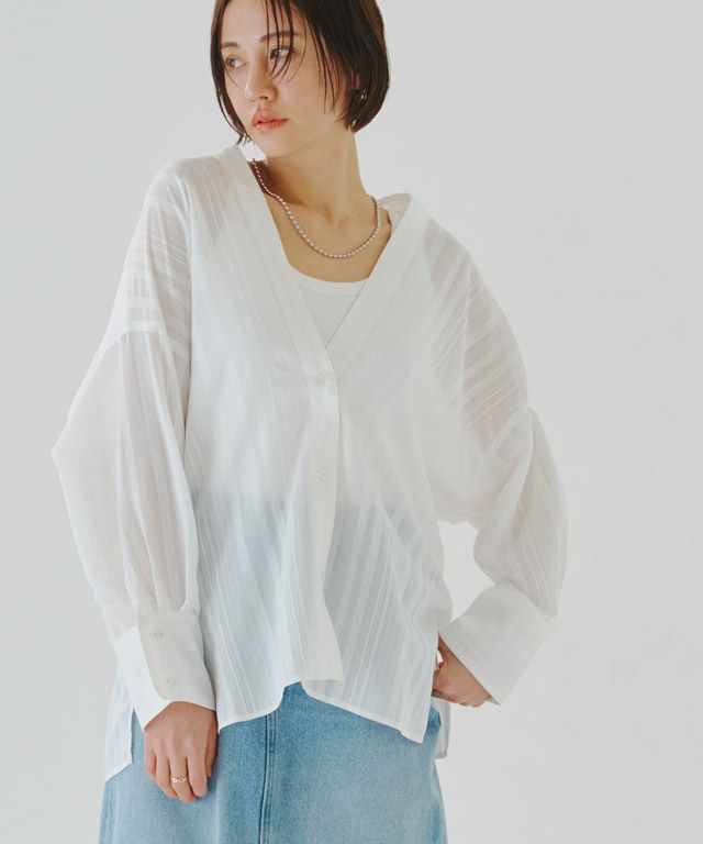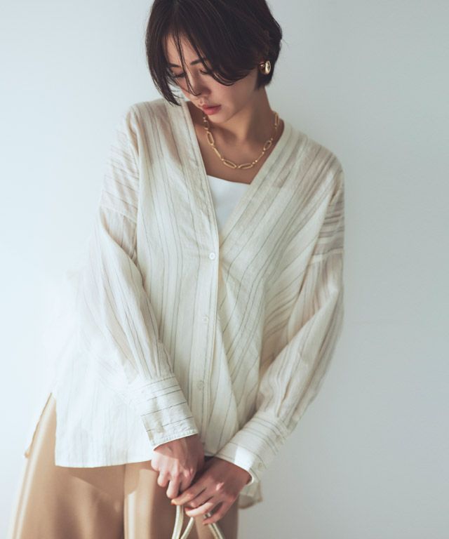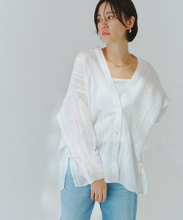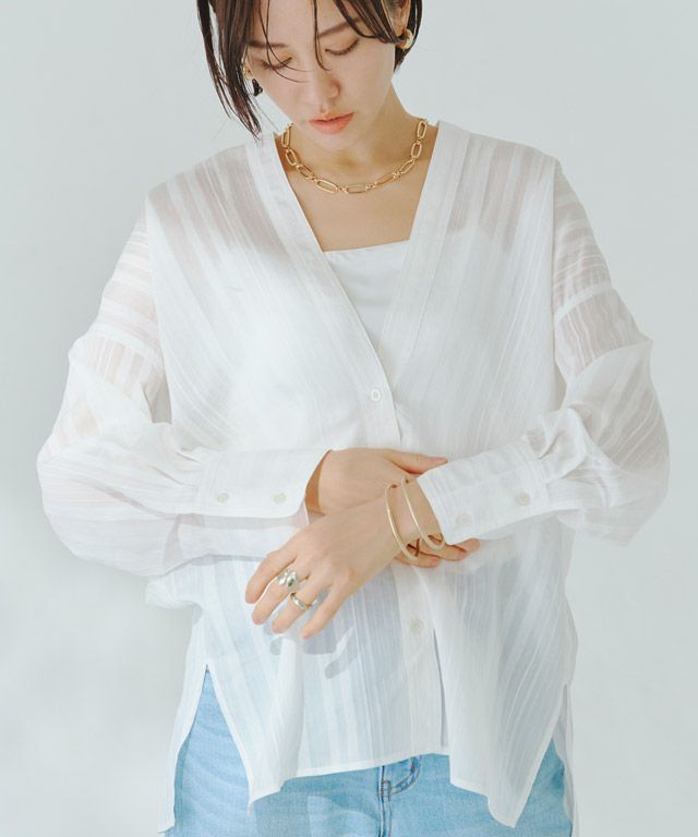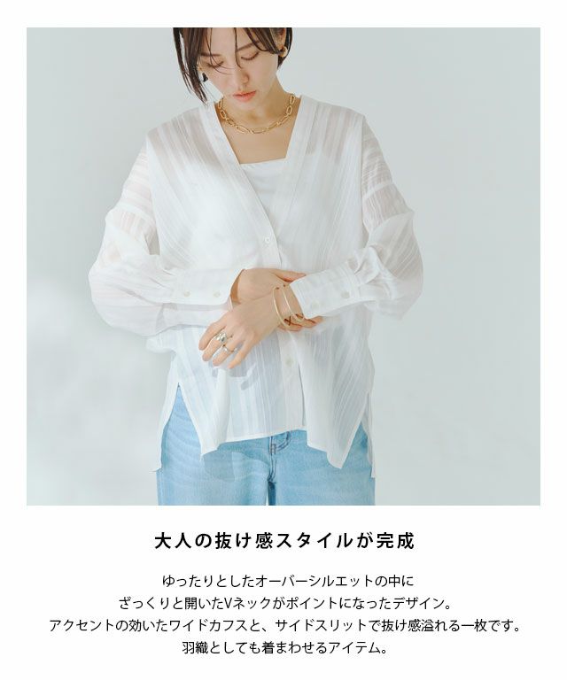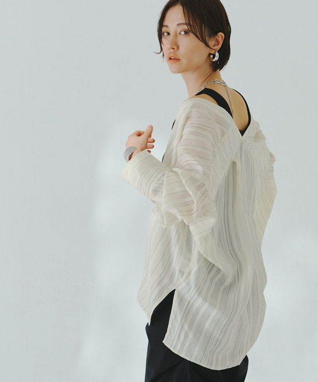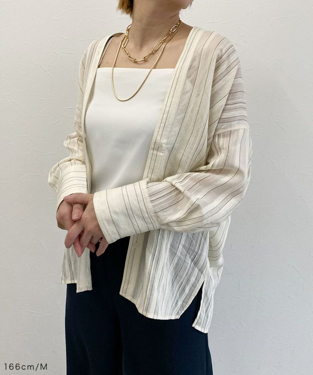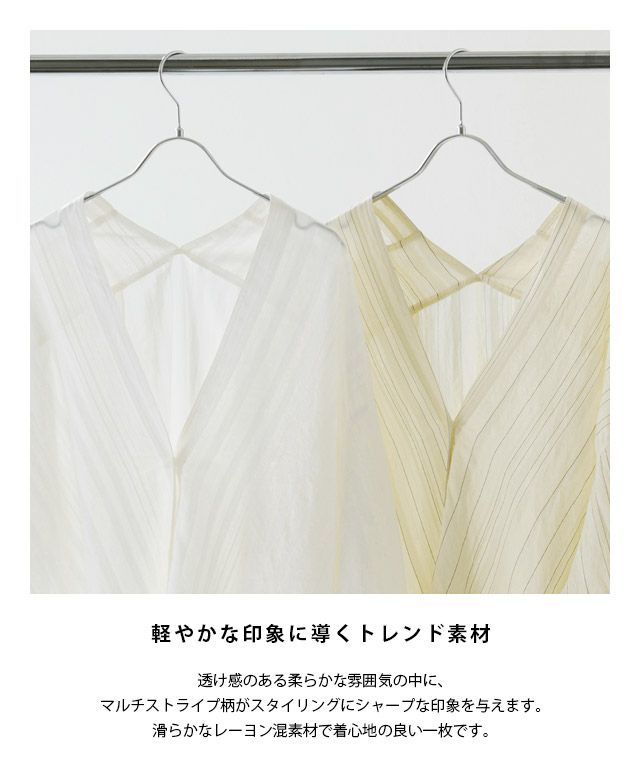 透け感のある柔らかな雰囲気の中に、マルチストライプ柄がスタイリングにシャープな印象を与えます。滑らかなレーヨン混素材で着心地の良い一枚です。
