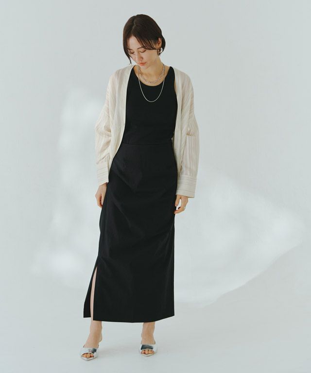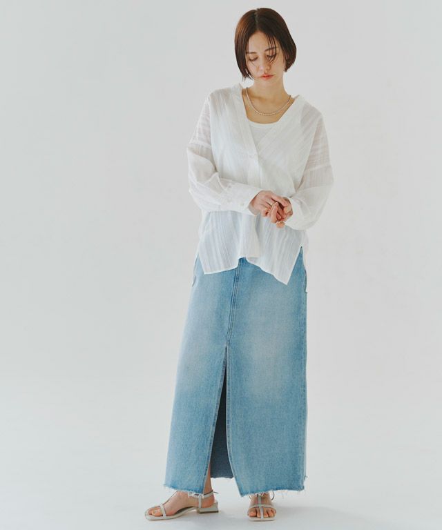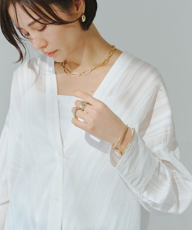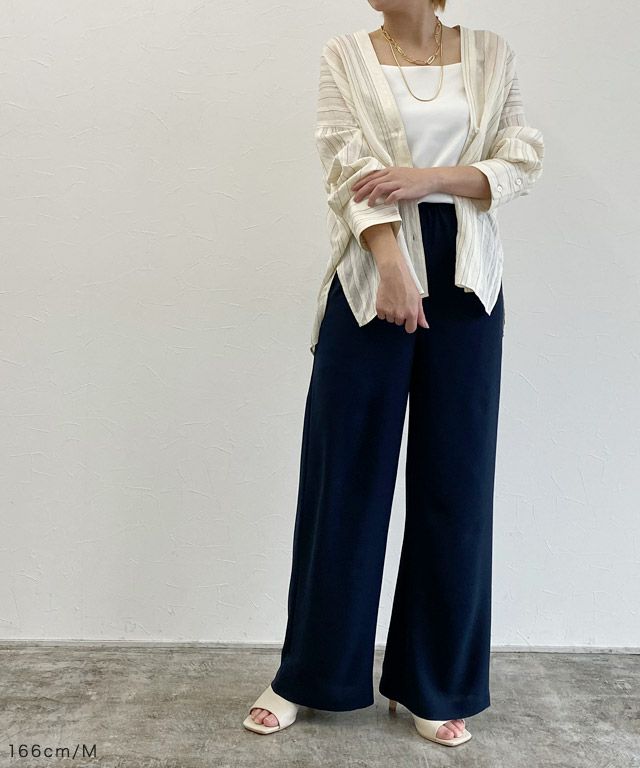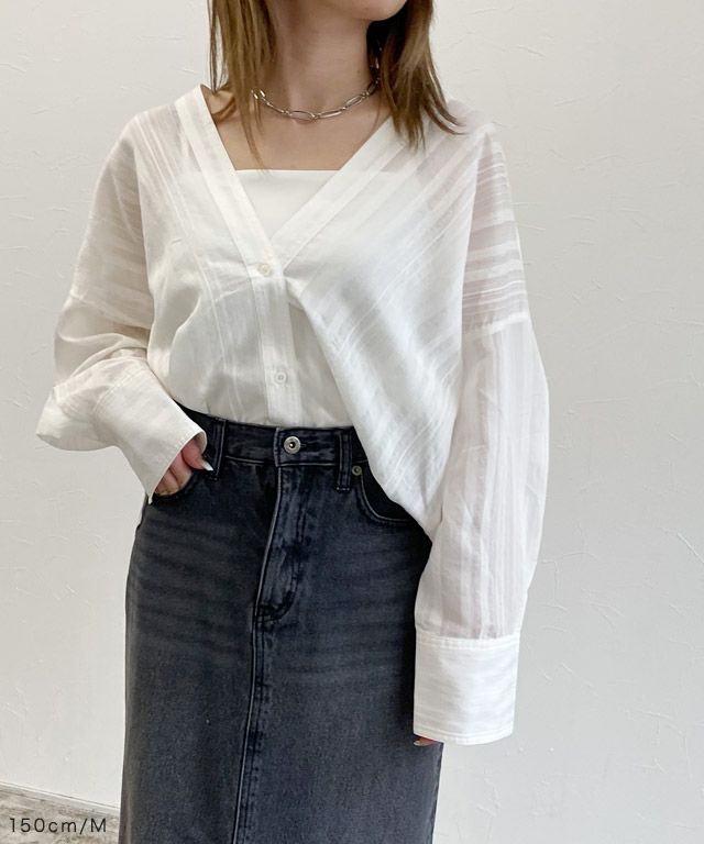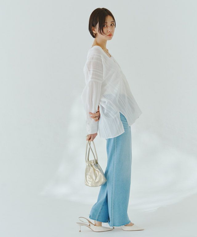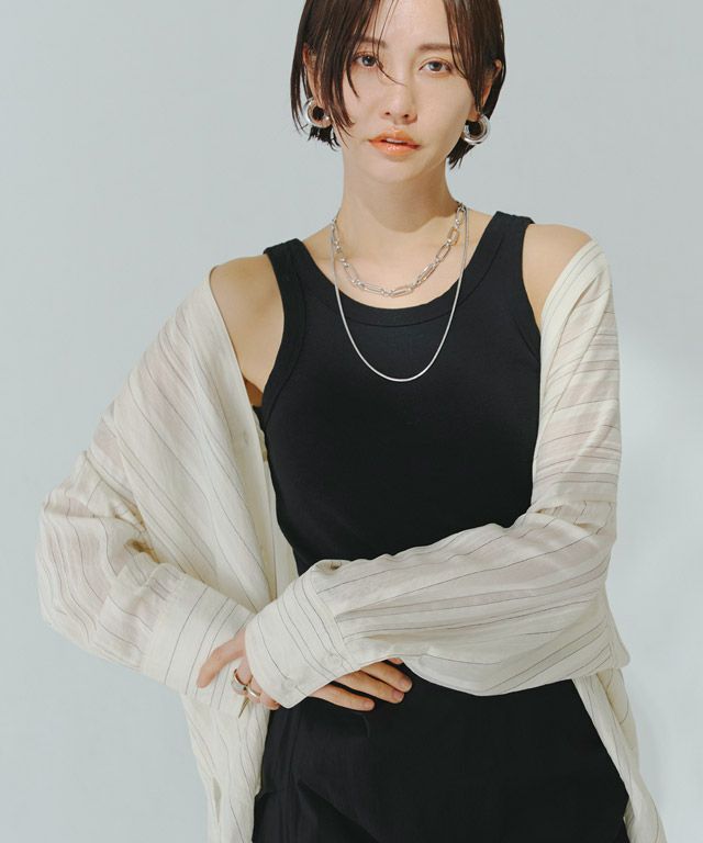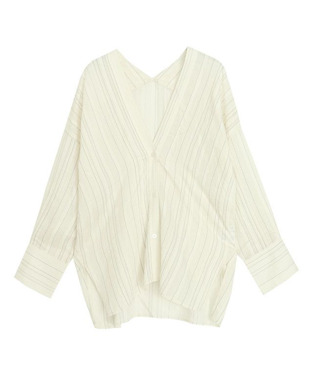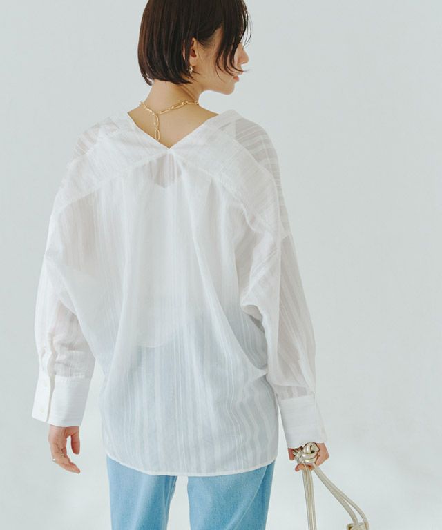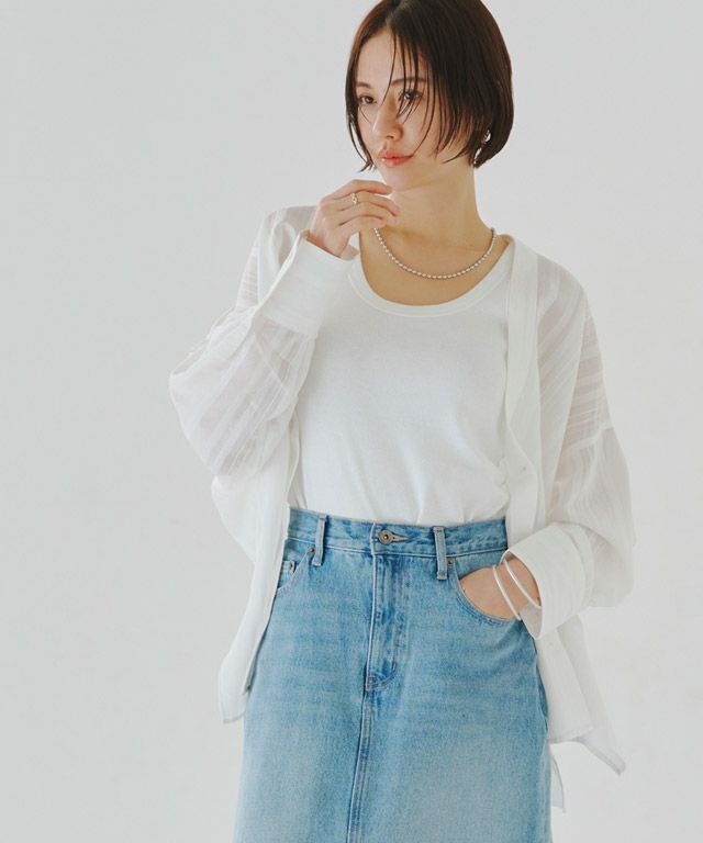 透け感のある柔らかな雰囲気の中に、マルチストライプ柄がスタイリングにシャープな印象を与えます。滑らかなレーヨン混素材で着心地の良い一枚です。