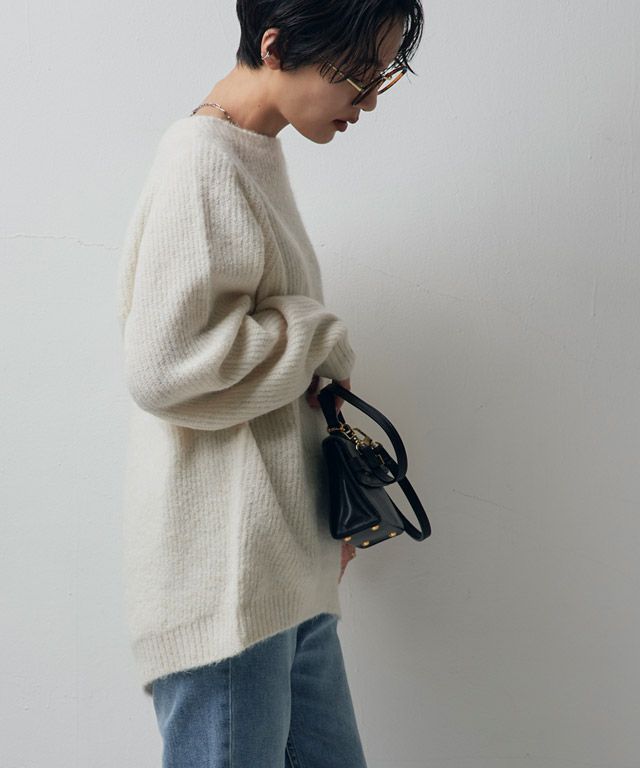 ボリュームのあるシルエットがゆるっと大人のこなれた雰囲気に導くニットプルオーバー。程良い開き具合のボートネックがデコルテ周りを華奢に見せてくれるデザインです。裾をラウンドカットにすることでヒップ周りをカバーしつつ、包み込むようなシルエットを作り出します。