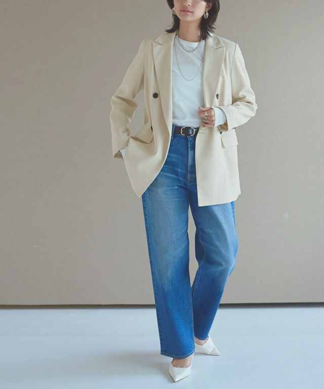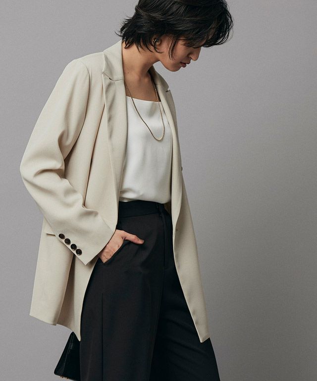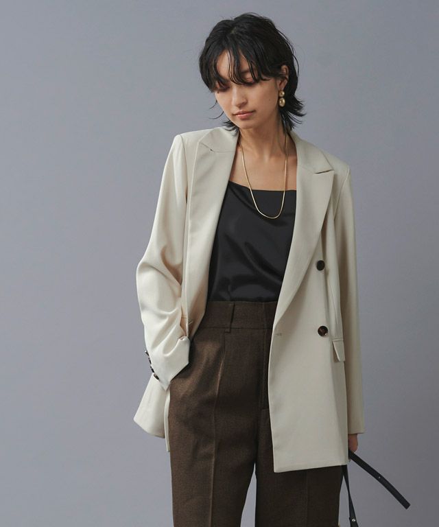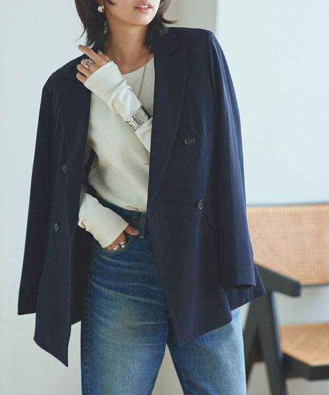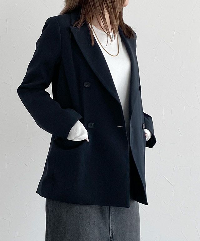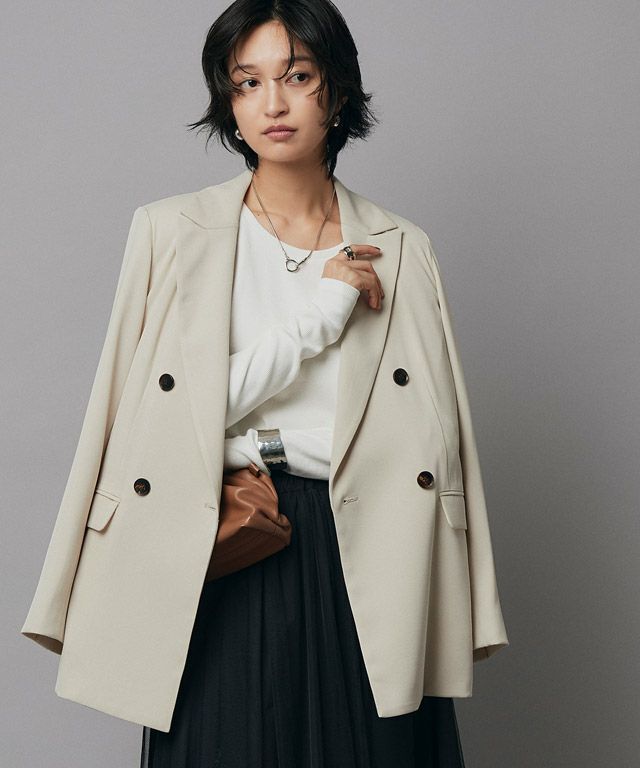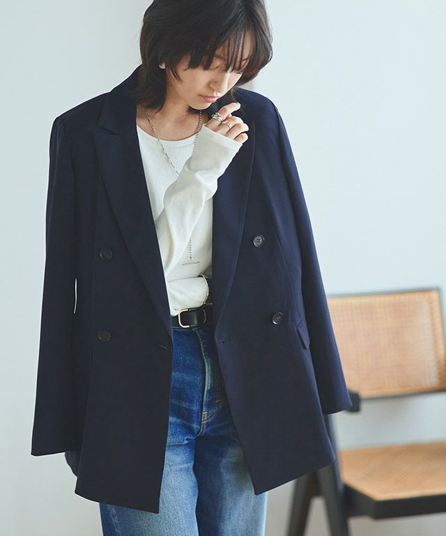 ダブルブレスト&ピークトラペルのデザインで、マニッシュな印象ながらも女性らしさのあるデザイン。シンプルなスタイリングに羽織ってもサマになるアイテムです。程よくゆったりとしたサイジングが、きっちり感はもちつつも、さらっと羽織りやすくどんなスタイリングにも合わせやすい一枚です。