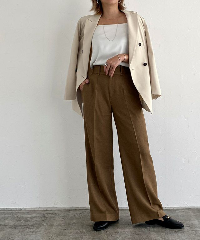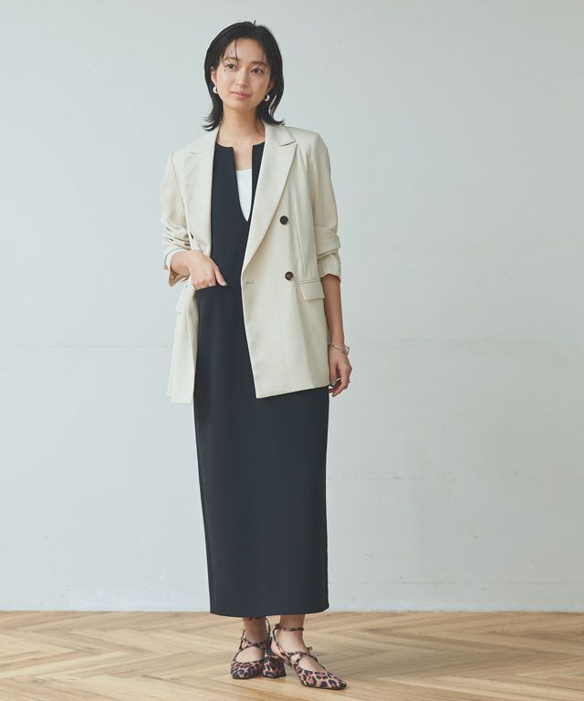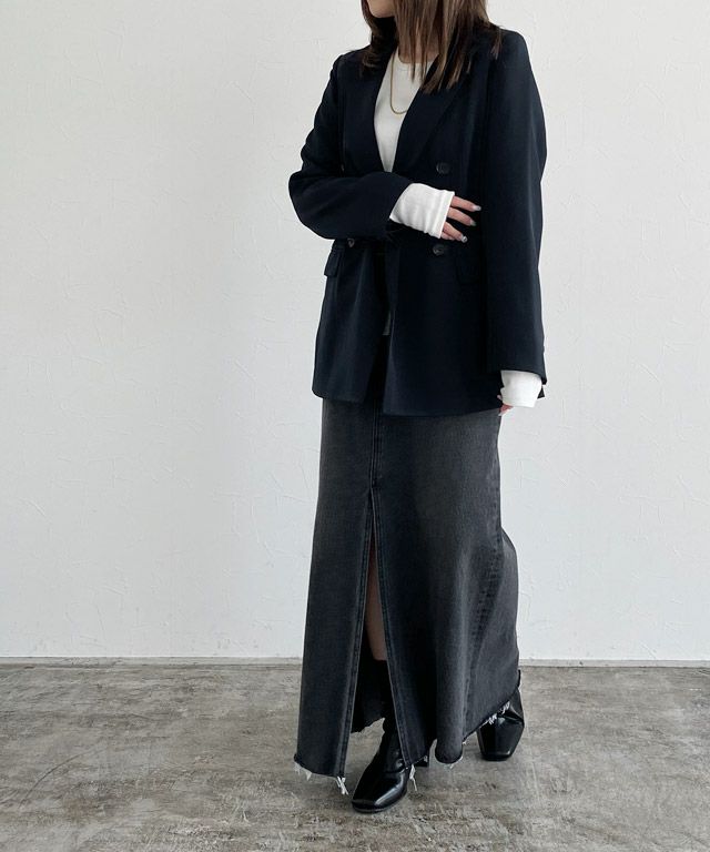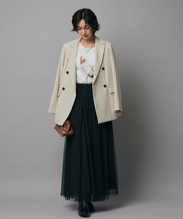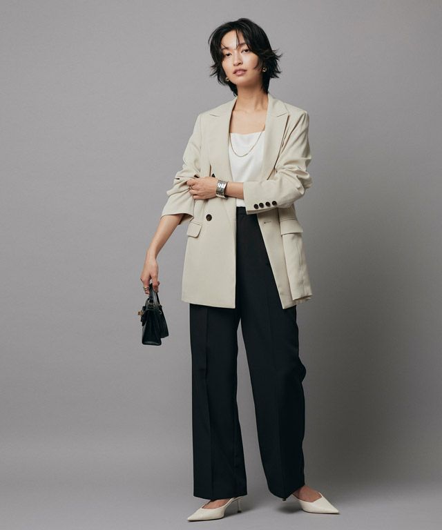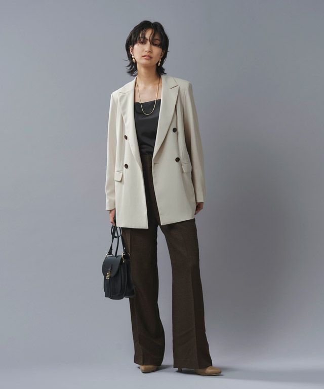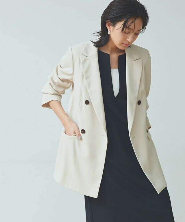 ダブルブレスト&ピークトラペルのデザインで、マニッシュな印象ながらも女性らしさのあるデザイン。シンプルなスタイリングに羽織ってもサマになるアイテムです。程よくゆったりとしたサイジングが、きっちり感はもちつつも、さらっと羽織りやすくどんなスタイリングにも合わせやすい一枚です。