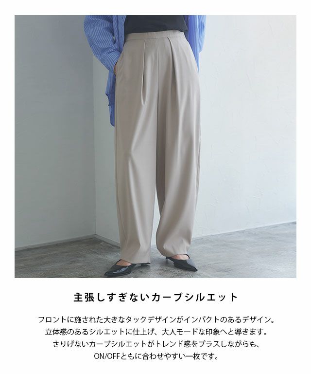 フロントに施された大きなタックデザインがインパクトのあるデザイン。立体感のあるシルエットに仕上げ、大人モードな印象へと導きます。さりげないカーブシルエットがトレンド感をプラスしながらも、ON/OFFともに合わせやすい一枚です。
