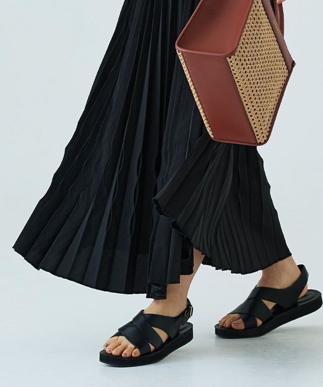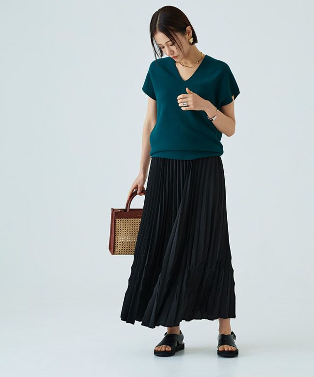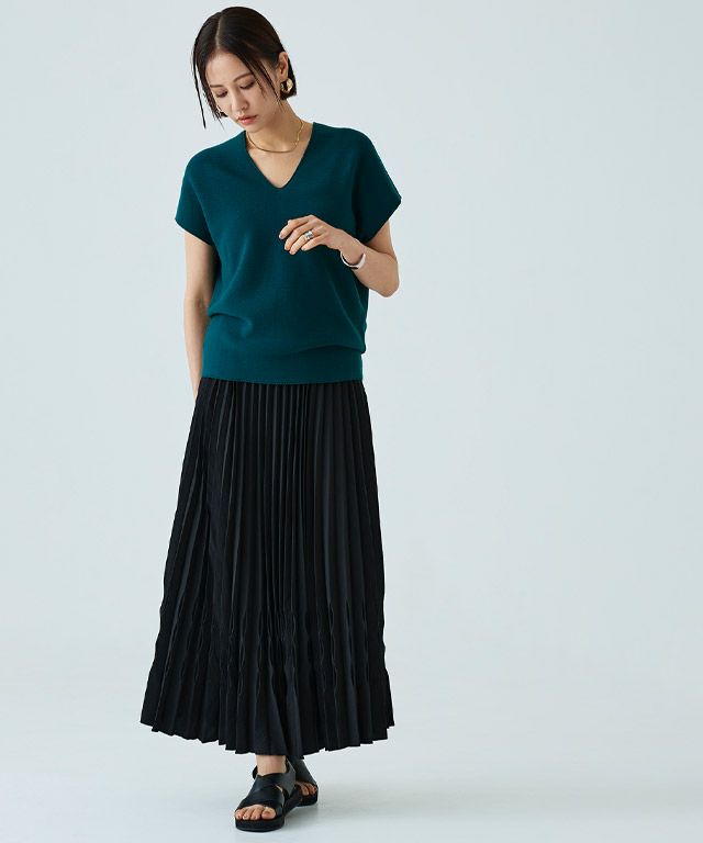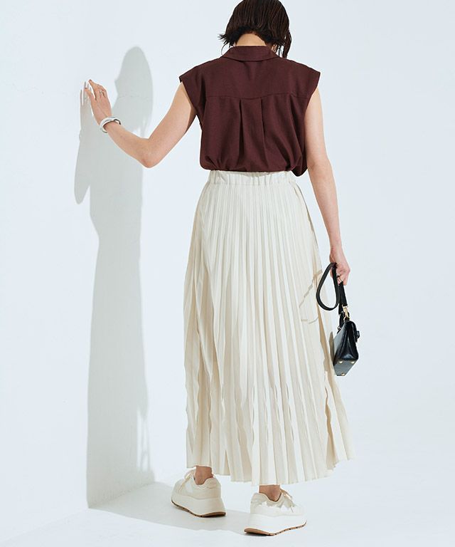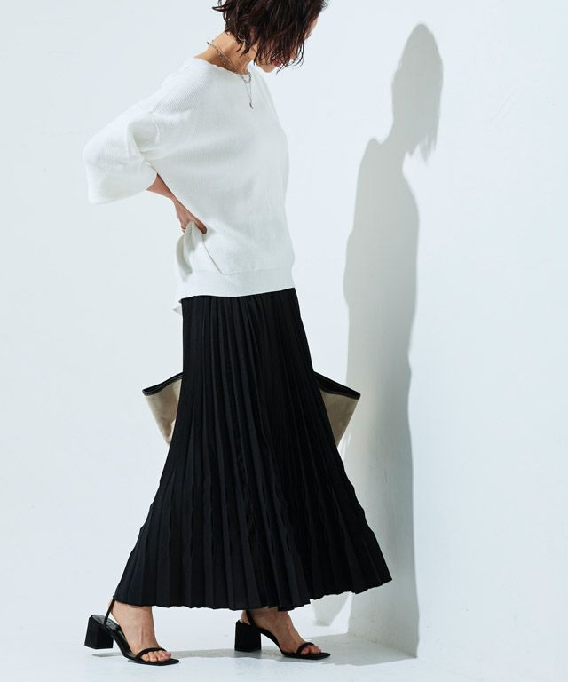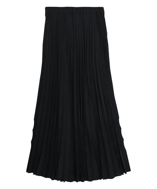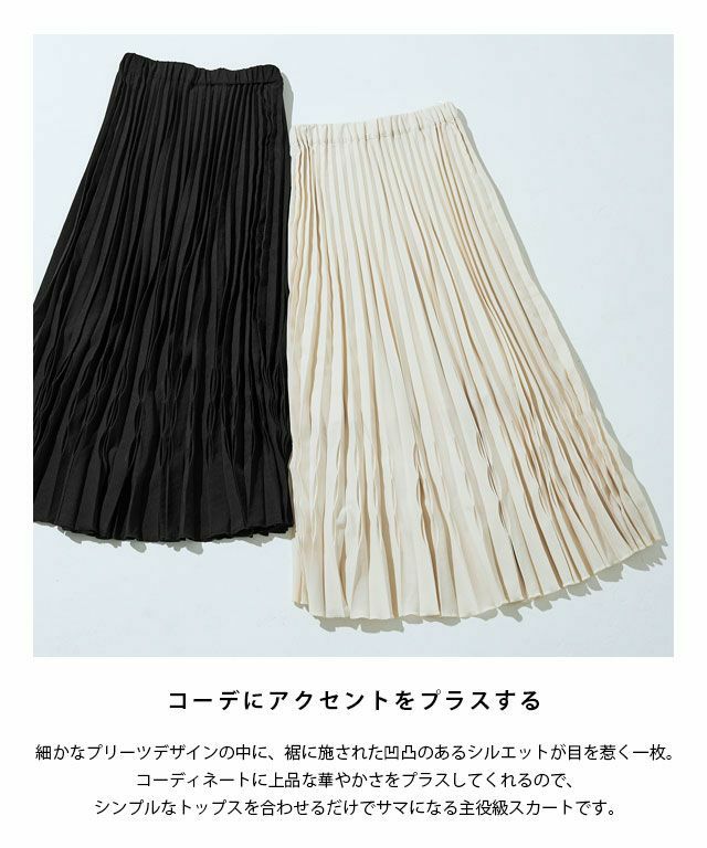 細かなプリーツデザインの中に、裾に施された凹凸のあるシルエットが目を惹く一枚。コーディネートに上品な華やかさをプラスしてくれるので、シンプルなトップスを合わせるだけでサマになる主役級スカートです。