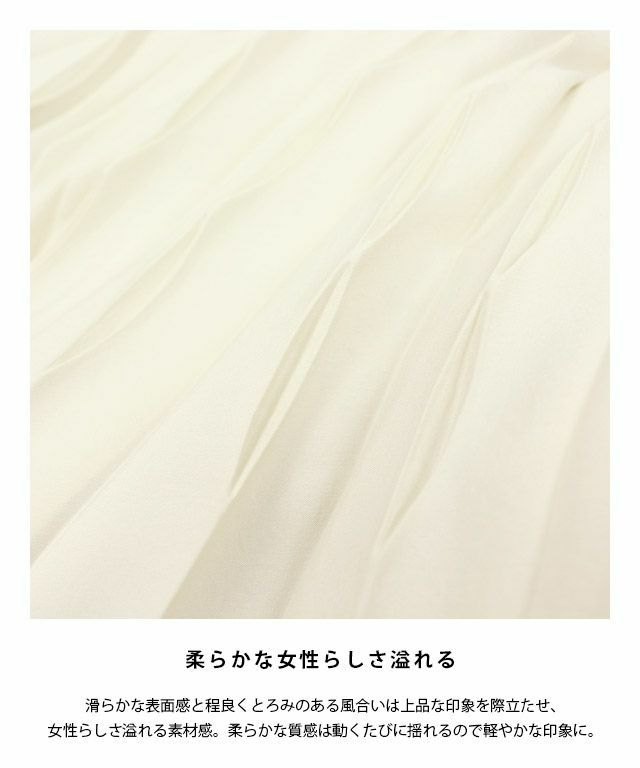 滑らかな表面感と程良くとろみのある風合いは上品な印象を際立たせ、女性らしさ溢れる素材感。柔らかな質感は動くたびに揺れるので軽やかな印象に。