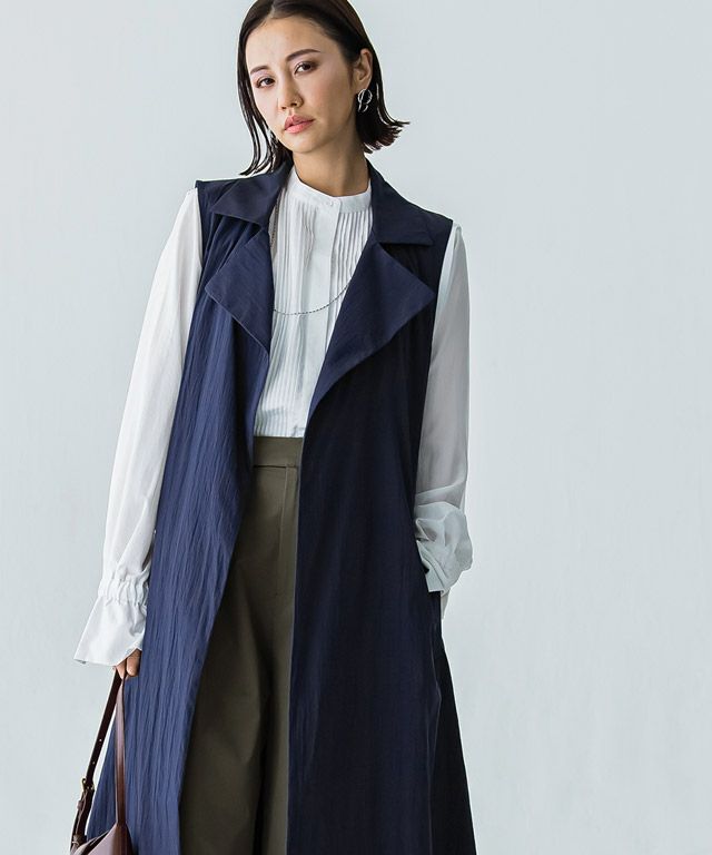トレンチコートとしても、ジレとしても着用できる2way仕様。足元まであるロング丈と、たっぷりとボリュームを持たせたシルエットがこなれた印象に導きます。トッパータイプなのでさらっと羽織るだけでサマになる一枚です。付属のベルトでウエストマークができ、様々な着こなしができるところもポイントです。
