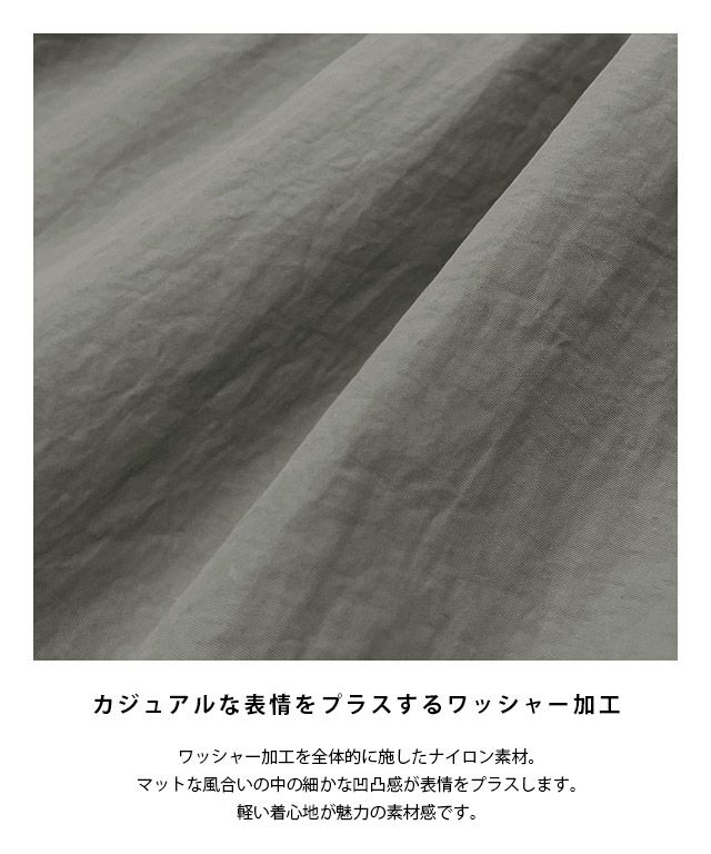 ワッシャー加工を全体的に施したナイロン素材。マットな風合いの中の細かな凹凸感が表情をプラスします。軽い着心地が魅力の素材感です。