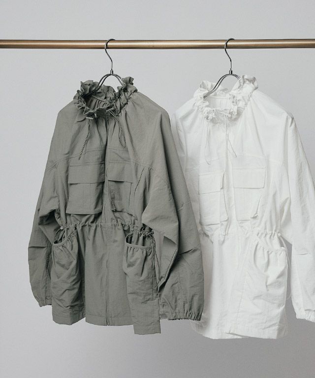 立体的なポケットがポイントになったワークジャケット風のライトブルゾン。ウエストのドロストデザインがメリハリのあるシルエットを作り出します。襟にもドロストを施し、フリルのような女性らしいアクセントをプラスしました。