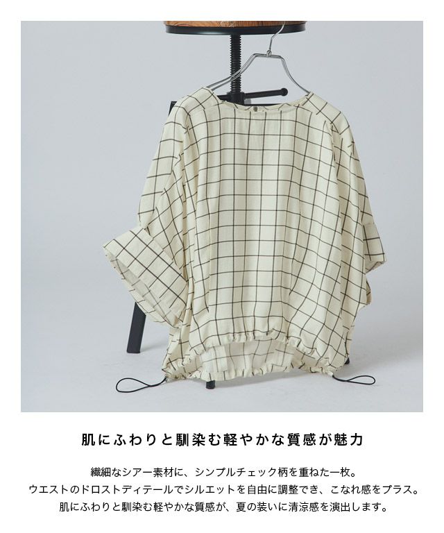 繊細なシアー素材にシンプルなチェック柄を重ねた一枚。ウエストのドローストリングディテールでシルエットを自由に調整でき、こなれた印象をプラス。肌にふわりと馴染む軽やかな質感が、夏の装いに清涼感を添えてくれます。