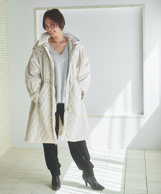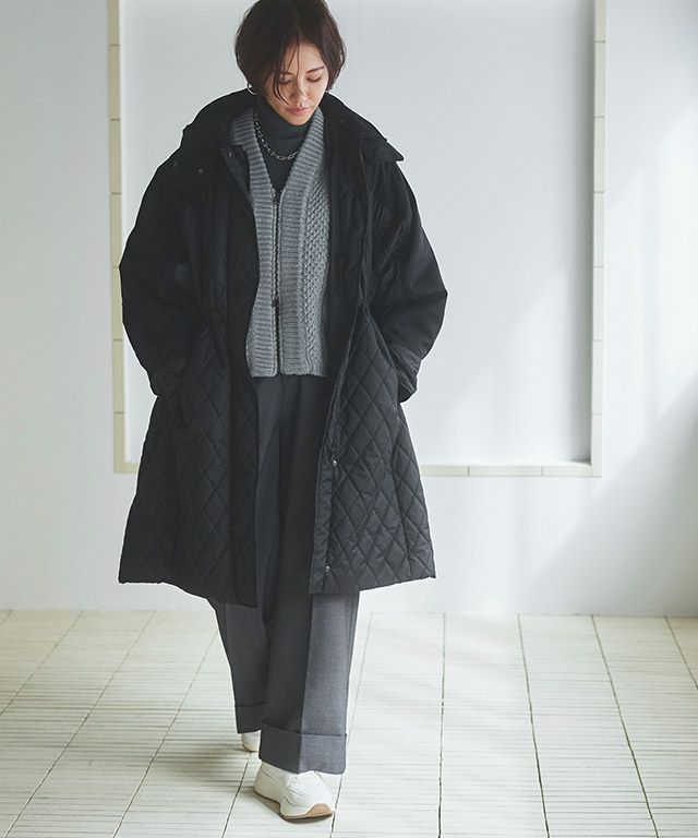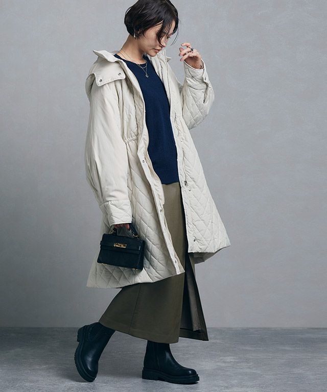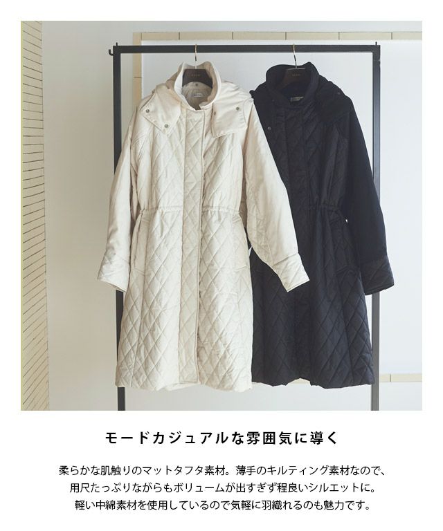 柔らかな肌触りのマットタフタ素材。薄手のキルティング素材なので、用尺たっぷりながらもボリュームが出すぎず程良いシルエットに。軽い中綿素材を使用しているので気軽に羽織れるのも魅力です。