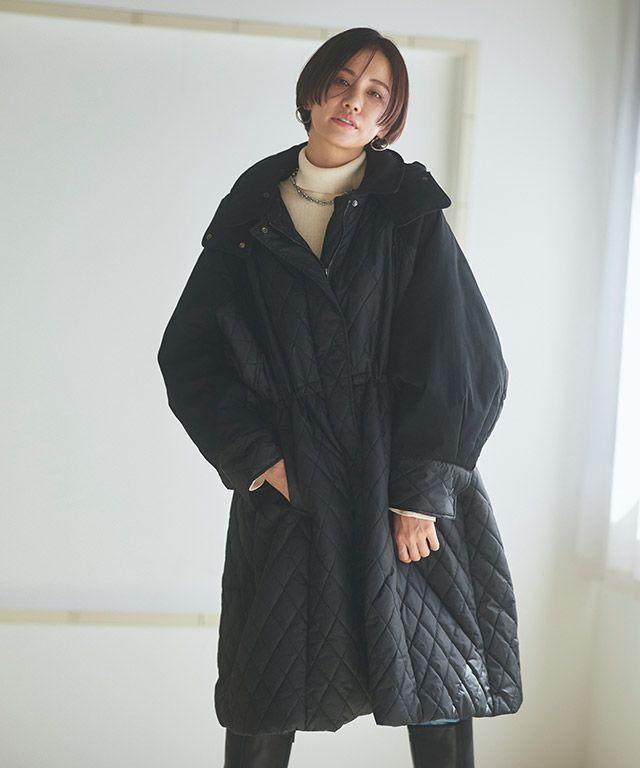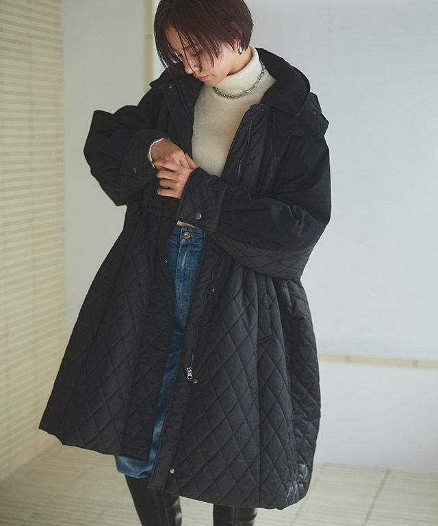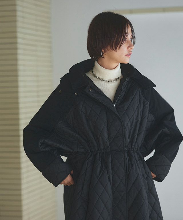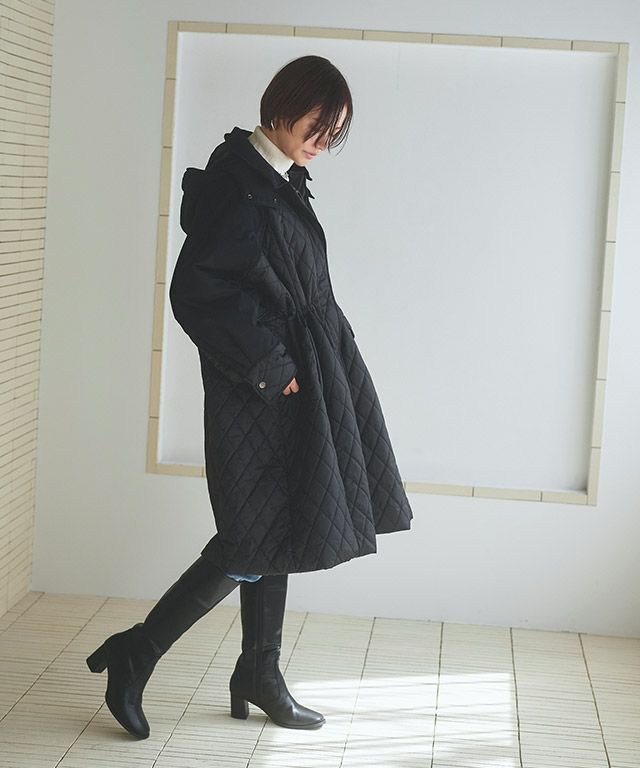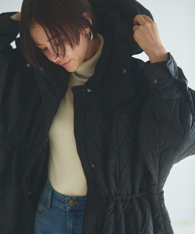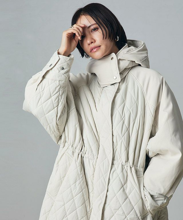 羽織るだけでキルティング素材が目を惹く主役級アウター。内側のドロストコードできゅっと絞ると女性らしいフレアシルエットが完成します。ラグランスリーブでカジュアルな雰囲気ながらもバックのヨークデザインで上品さも取り入れました。フードは取り外し可能なのでシーンに合わせてスタイリングを楽しめます。