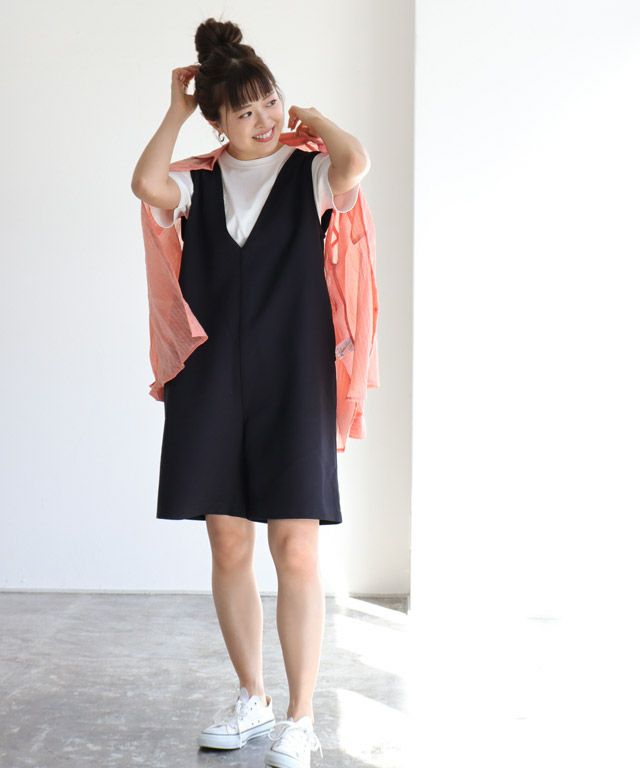 J 着丈は膝上の丈感でした。袖丈は肩が見えます。身幅はゆとりがありました。ウエストはゆとりがあり、ヒップにはゆとりがあります。脚周りはさらっとした素材です。全体的にゆったりとしたシルエットなので窮屈感なく動きやすいです。