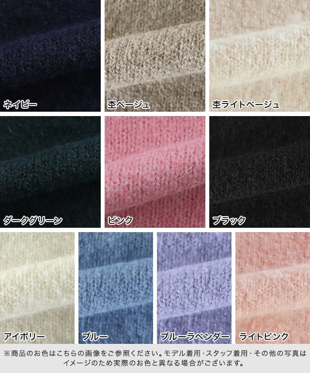 また、ニット製品は生産の過程上「生地を織る際の糸の継ぎ目」繊維の「混紡」、プレス加工、製品洗い加工によって形やサイズ(5cm前後)に誤差が生じる場合がございますが品質上の問題はございません。