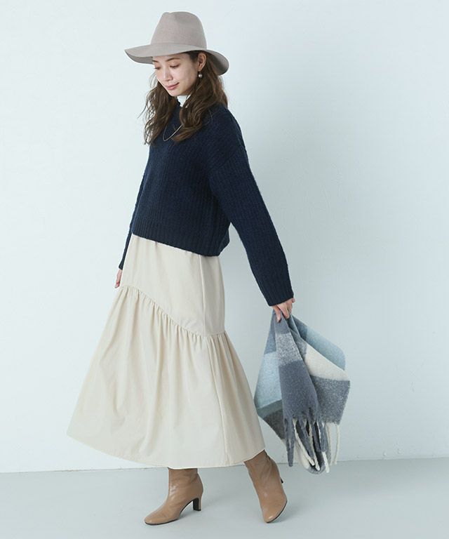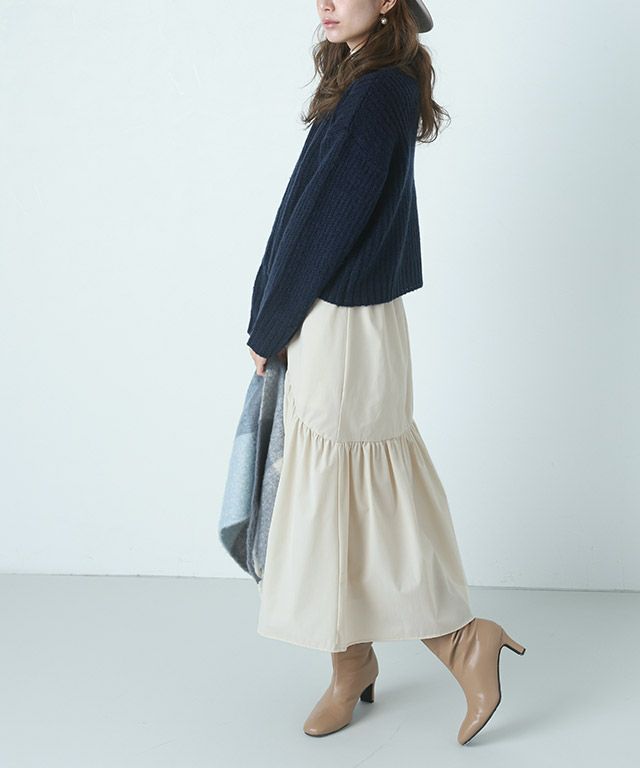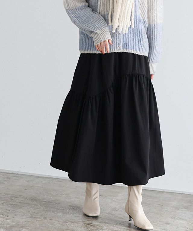 ボリューム感が可愛いギャザー切り替えのスカート。たっぷりギャザーを施したティアードシルエットが、女性らしさを高めるデザインです。アーチ状の切り替えで存在感があり、シンプルなニットに合わせるだけでも旬な装いに◎