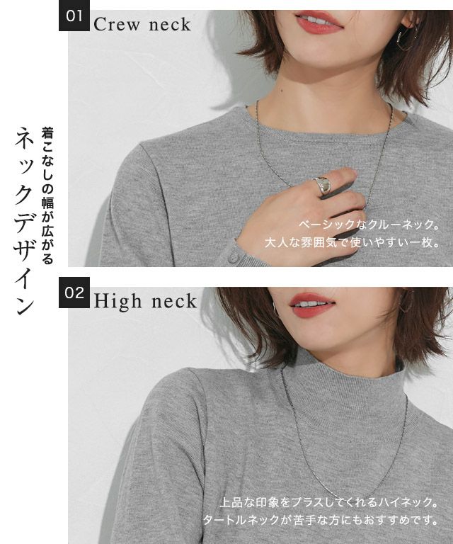レーヨン混でもちもちな肌触りのニット。素肌に触れてもチクチク感のない、柔らかな肌触りが魅力の一つ。やや薄手にすることでレイヤードやジャケットのインナーなどでも響きにくく着用しやすい一枚に仕上げました。
