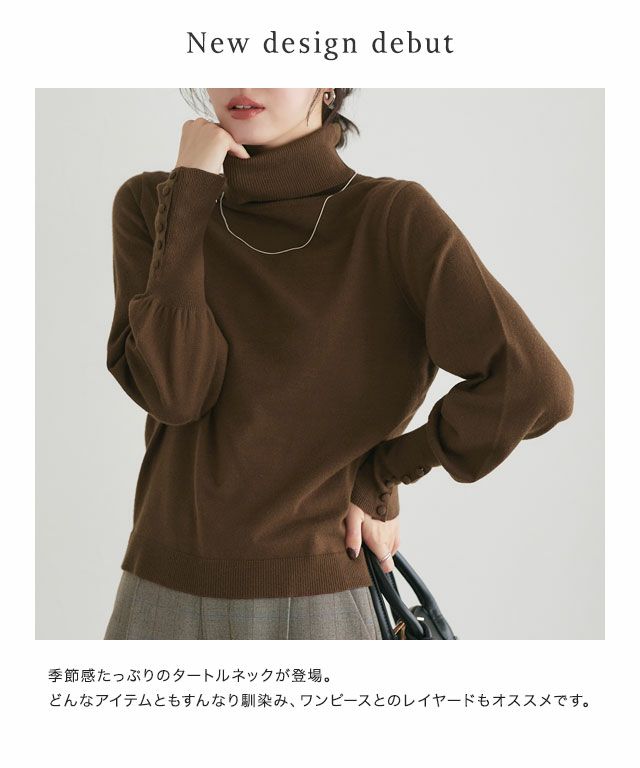 デイリーに使えて着回しの効く“ネックが選べるクルミボタンボリューム袖ニット”