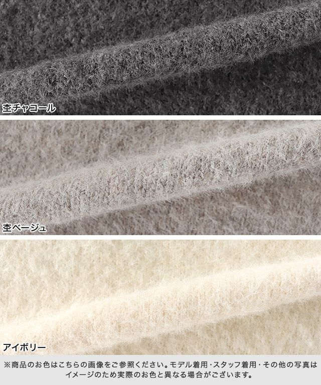 ふんわり柔らかな風合いで暖かみがありつつも、軽い着心地のニット素材。毛足の短いシャギー素材を使用しているので大人な雰囲気へと導いてくれ、毛足が抜けにくいところも嬉しいポイントです。