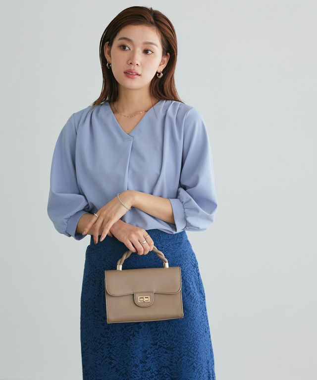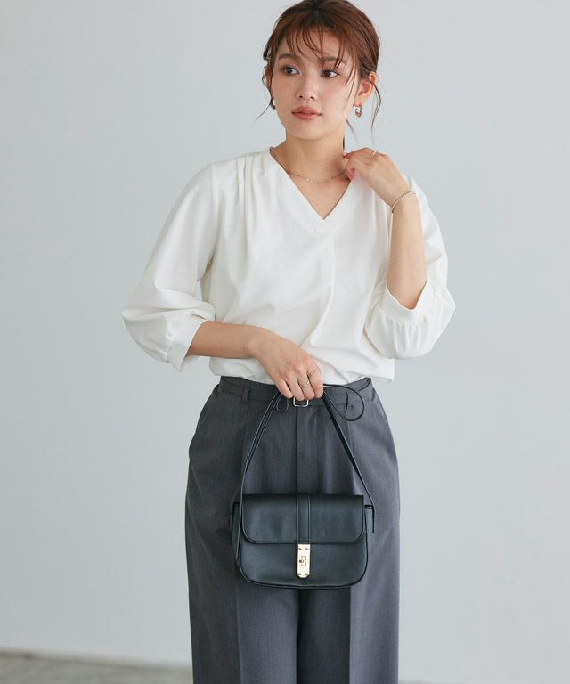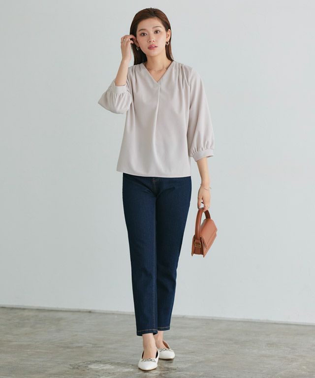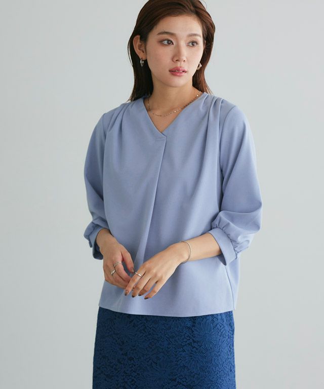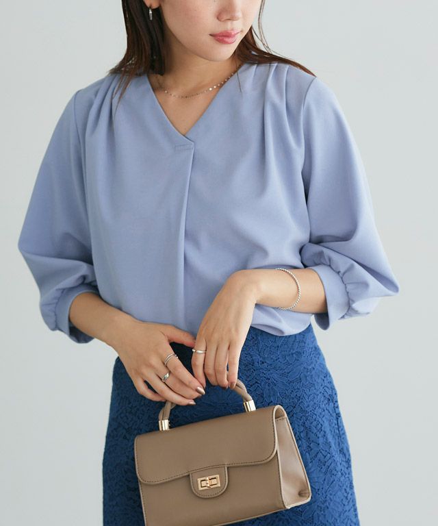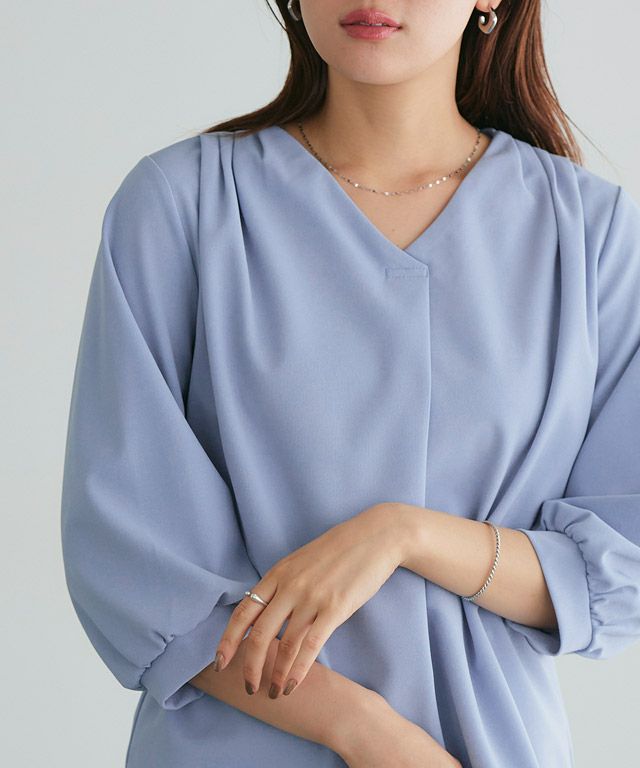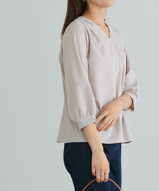 首元をすっきりと見せてくれるVネック。肩部分に施したタックで のっぺりせず、大人な雰囲気に◎ボリュームのある袖でフェミニンさを プラスしつつ七分袖で抜け感を演出した一枚に仕上げました。
