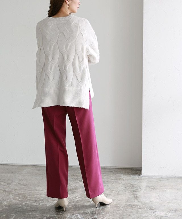 また、ニット製品は生産の過程上「生地を織る際の糸の継ぎ目」繊維の「混紡」、プレス加工、製品洗い加工によって形やサイズ(5cm前後)に誤差が生じる場合がございますが品質上の問題はございません。