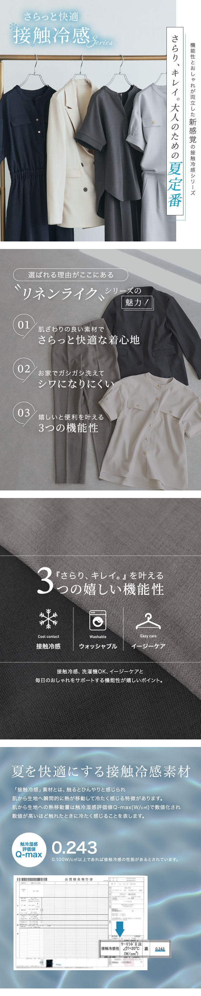 リネンタッチのような風合いでさらっとした軽い着心地が魅力的な素材。洗濯してもシワになりにくく、接触冷感の機能付きで夏でも快適にお召しいただけます。ご自宅でお洗濯が可能なところも嬉しいポイント。