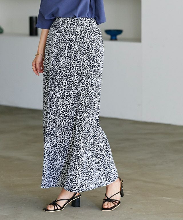 裾に向けて広がったフレアラインが女性らしいスカート。小さめのフラワープリントでカジュアルにもフェミニンにも着こなせる一枚です。ウエストはバックゴム仕様でリラックスした穿き心地。