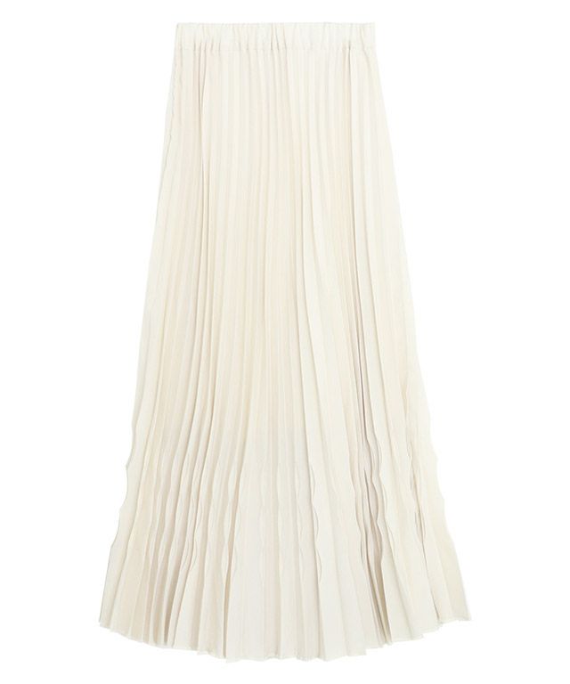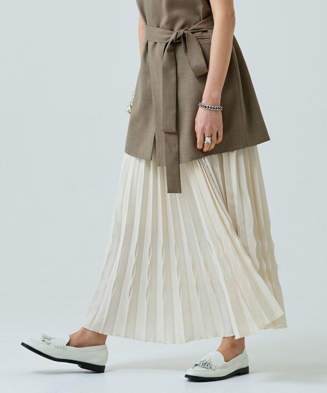 細かなプリーツデザインの中に、裾に施された凹凸のあるシルエットが目を惹く一枚。コーディネートに上品な華やかさをプラスしてくれるので、シンプルなトップスを合わせるだけでサマになる主役級スカートです。