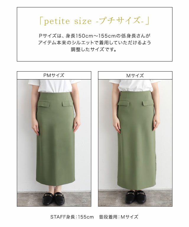 フロントサイドにデザインされたポケットが程よくアクセントに。すっきりとした見た目ですが、ヒップラインを拾い過ぎない絶妙なサイズ感もポイントです。カジュアルになりすぎないように、あえてミニマルなデザインにこだわりました。前後2wayで着用できるのも嬉しいポイント。