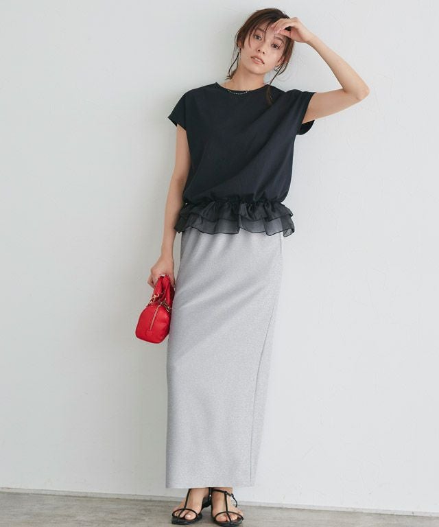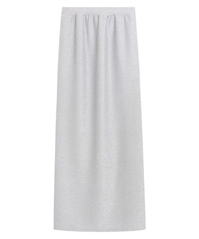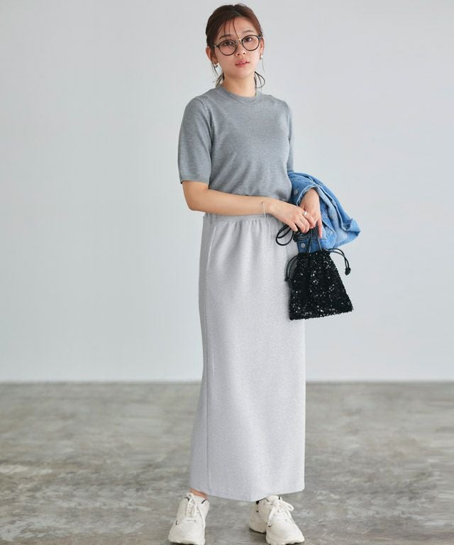 トレンド感のあるラメスカート。ストレッチの効いた動きやすいニットソー素材で取り入れやすのが魅力です。
