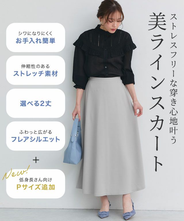 春夏のデイリーシーンに着回し抜群“機能性2丈フレアスカート”ウォッシャブル、UVカット、接触冷感の3つの機能を持ち合わせた素材。落ち感がありキレイ見えするカットジョーゼットを使用。透けにくく程良い厚みでストレッチ性のある生地感が特徴です。
