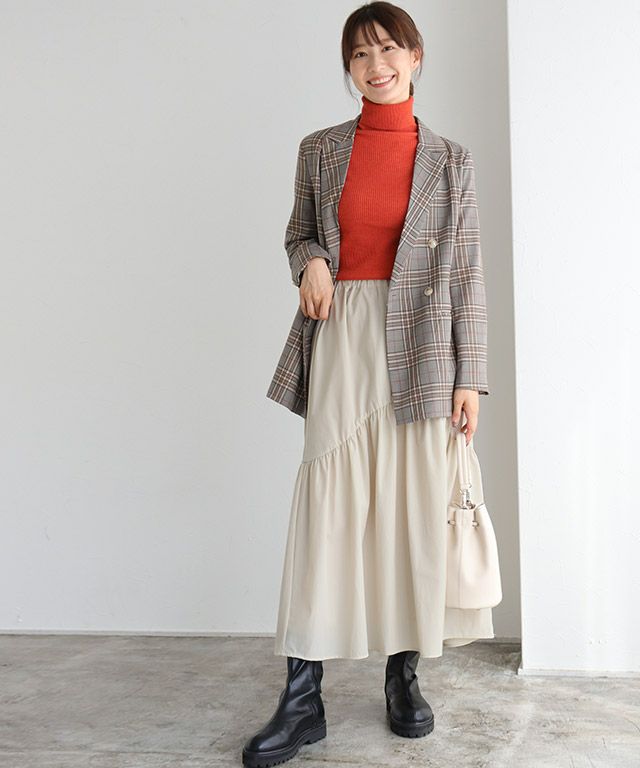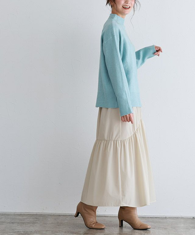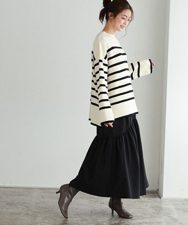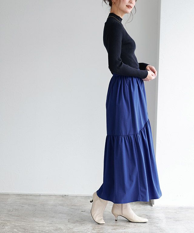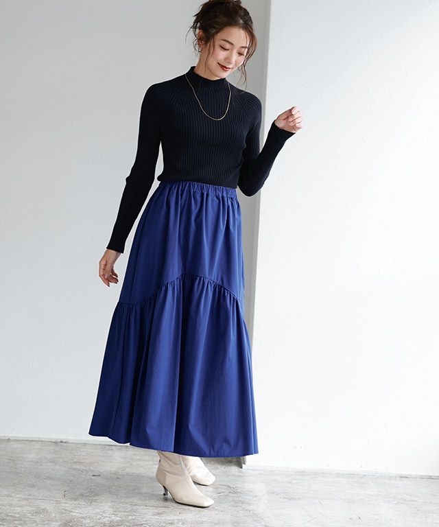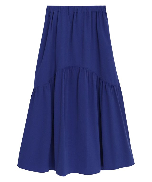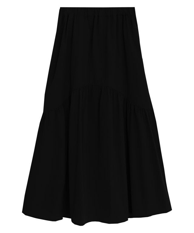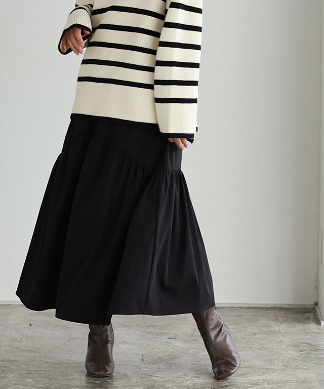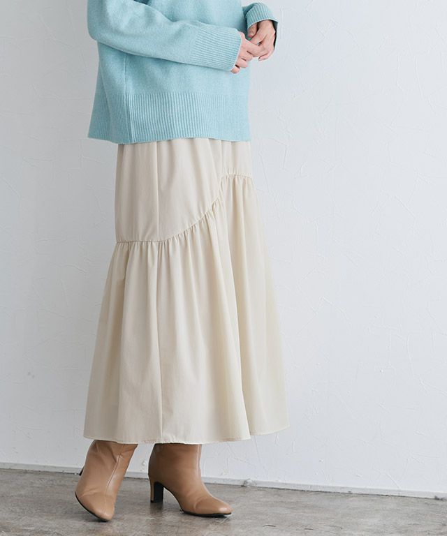 ボリューム感が可愛いギャザー切り替えのスカート。たっぷりギャザーを施したティアードシルエットが、女性らしさを高めるデザインです。アーチ状の切り替えで存在感があり、シンプルなニットに合わせるだけでも旬な装いに◎