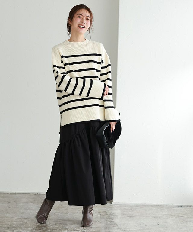 また、ニット製品は生産の過程上「生地を織る際の糸の継ぎ目」繊維の「混紡」、プレス加工、製品洗い加工によって形やサイズ(5cm前後)に誤差が生じる場合がございますが品質上の問題はございません。
