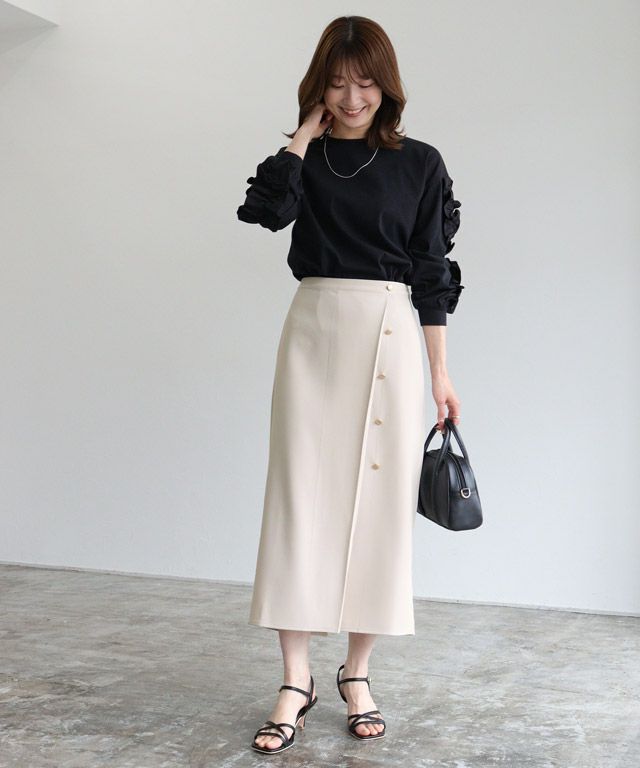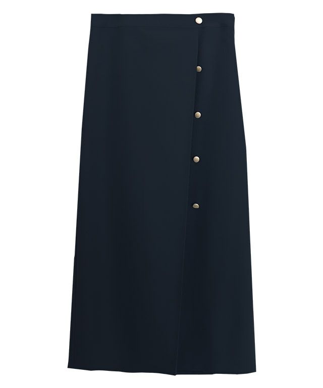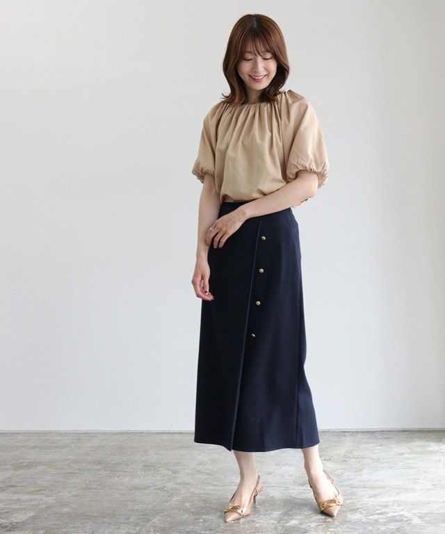 ラップ風デザインとゴールドボタンが、シンプルなコーディネートにアクセントをプラス。ストンと落ちるタイト過ぎないシルエットで体系カバーも叶えてくれる一枚です◎