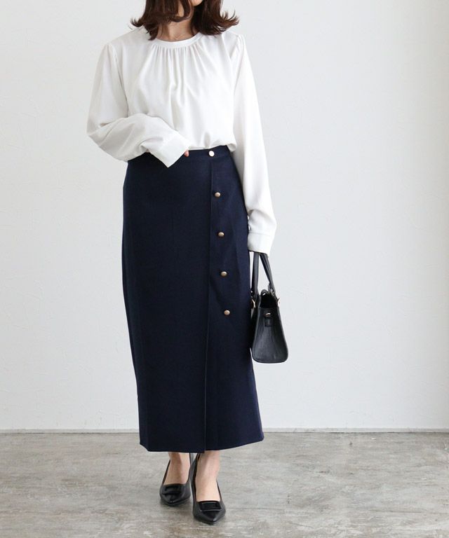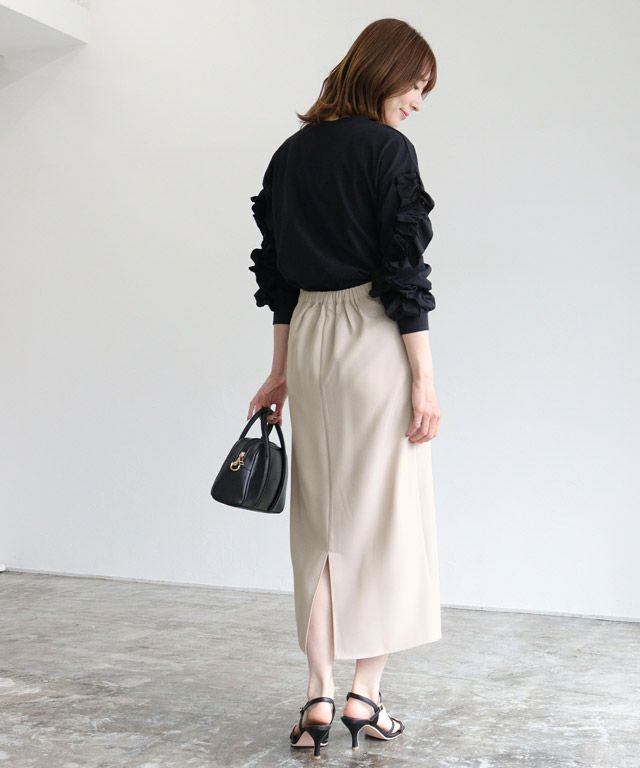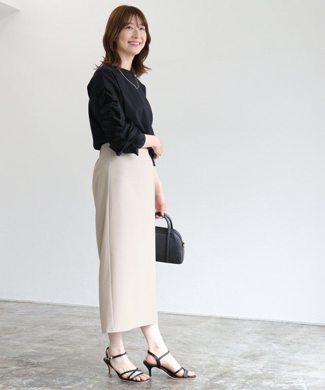 落ち感のある”とろみ素材”を使用し、きちんとした印象をプラスします。程よい厚みもありシーズン問わず活躍するところも魅力の一つです。
