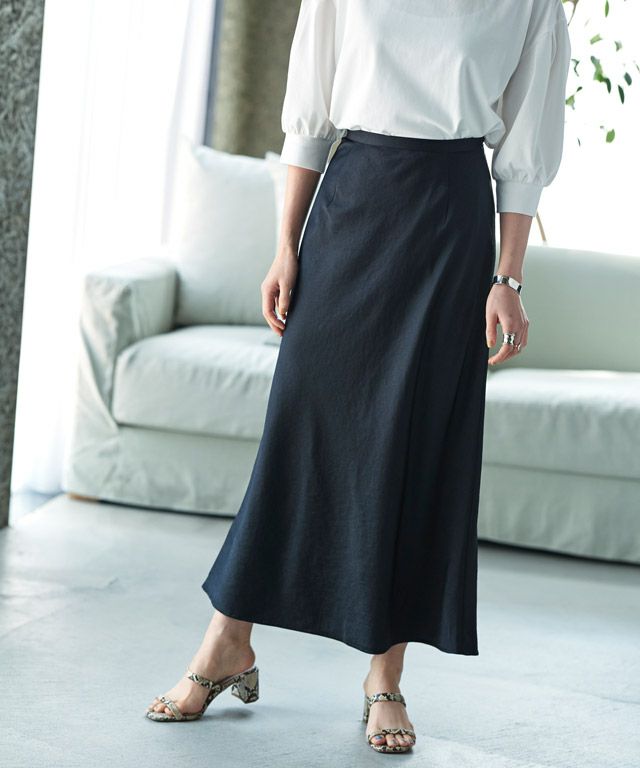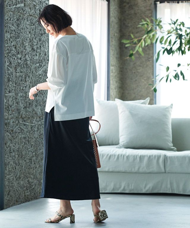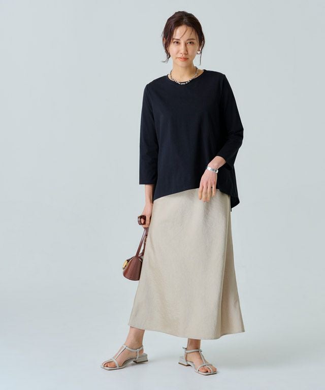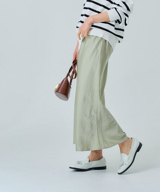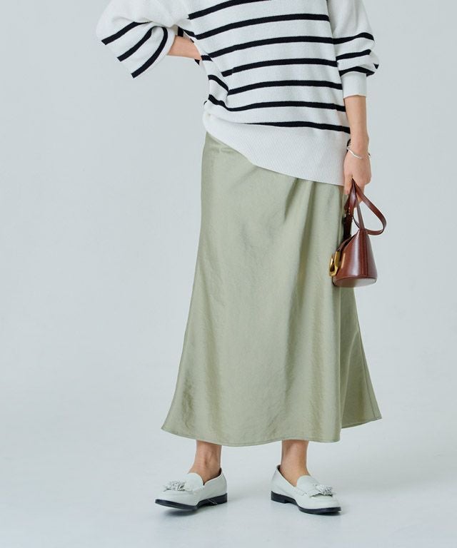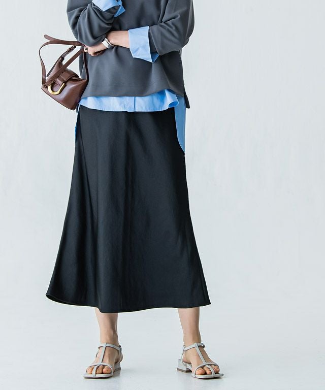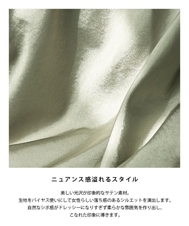 美しい光沢が印象的なサテン素材。生地をバイヤス使いにして女性らしい落ち感のあるシルエットを演出します。自然なシボ感がドレッシーになりすぎず柔らかな雰囲気を作り出し、こなれた印象に導きます。