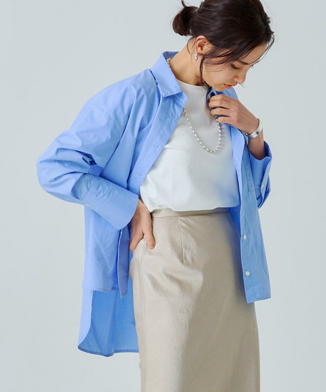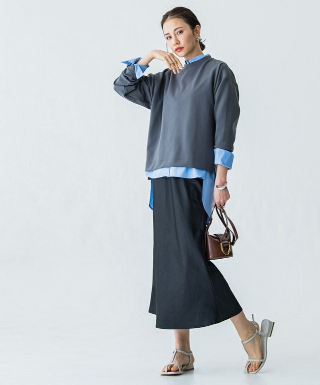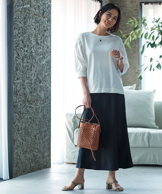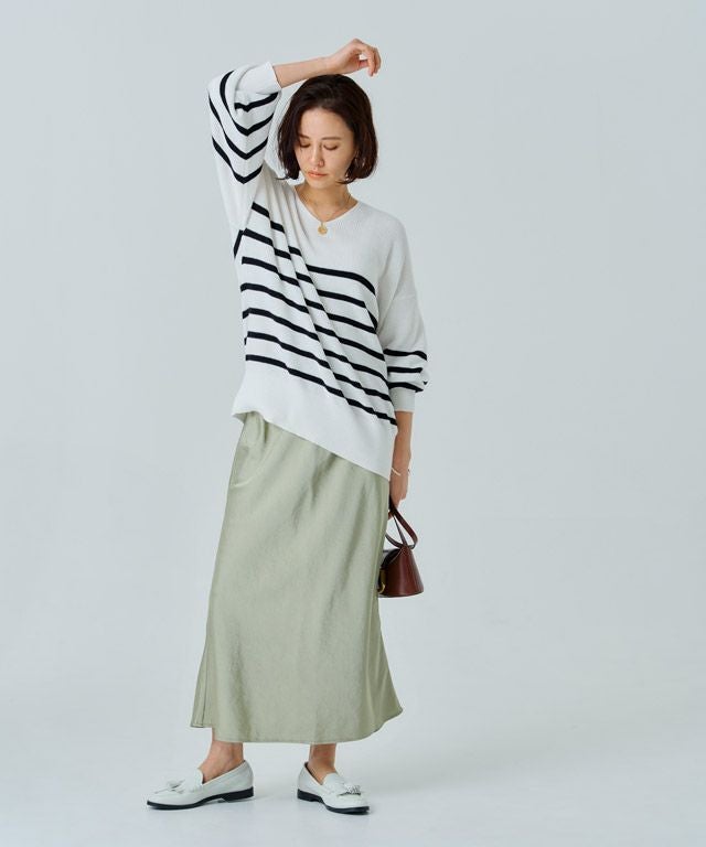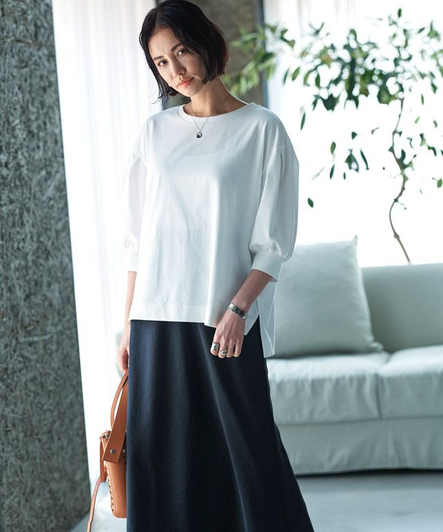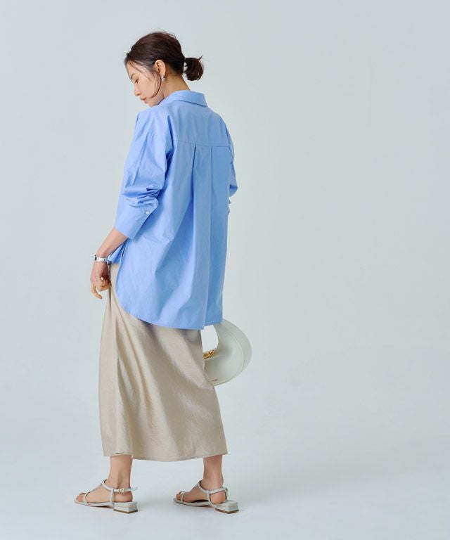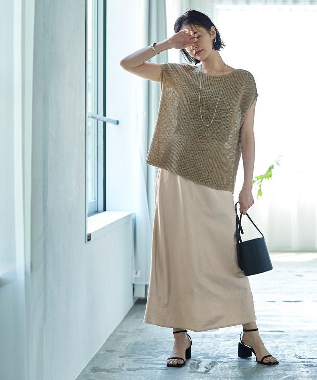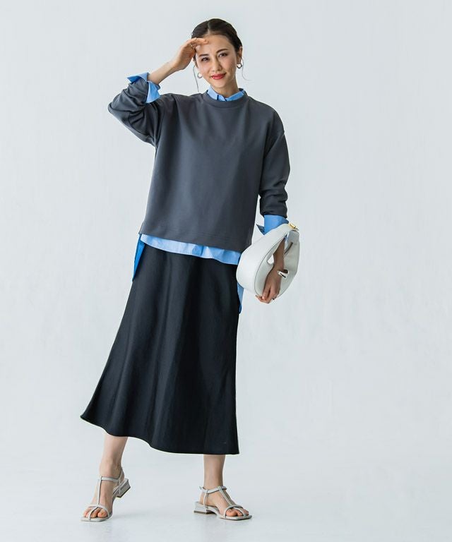 美しい光沢が印象的なサテン素材。生地をバイヤス使いにして女性らしい落ち感のあるシルエットを演出します。自然なシボ感がドレッシーになりすぎず柔らかな雰囲気を作り出し、こなれた印象に導きます。