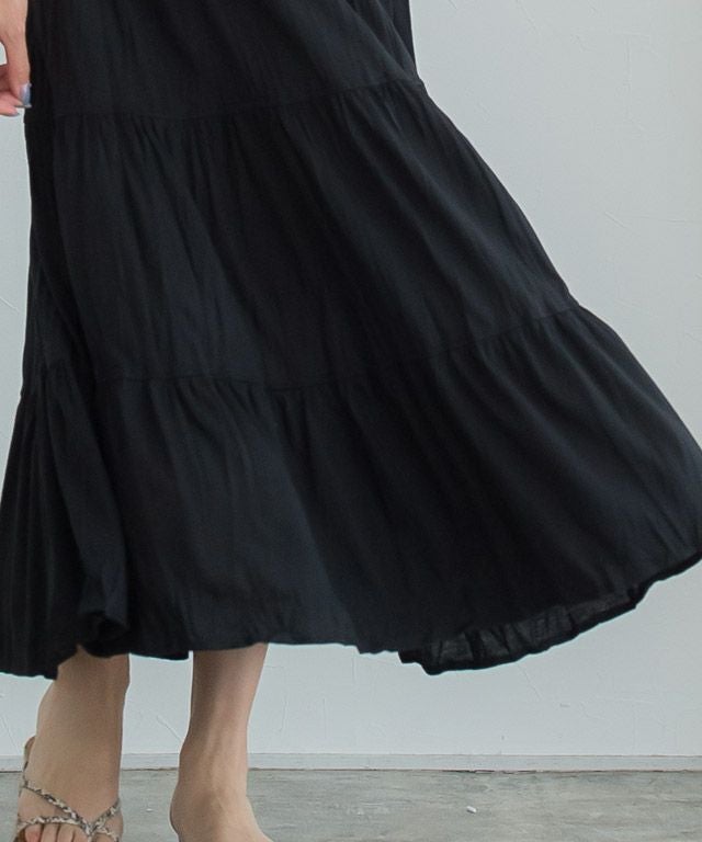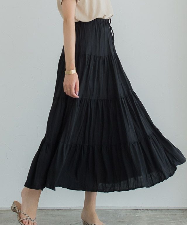 切り替えになったティアードデザインとふんわり広がるフレアラインが女性らしいデザイン。トップスも合わせやすく一枚でトレンドスタイルに◎