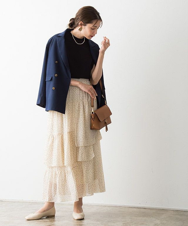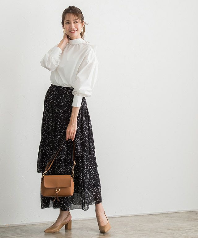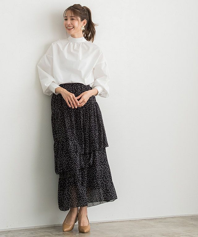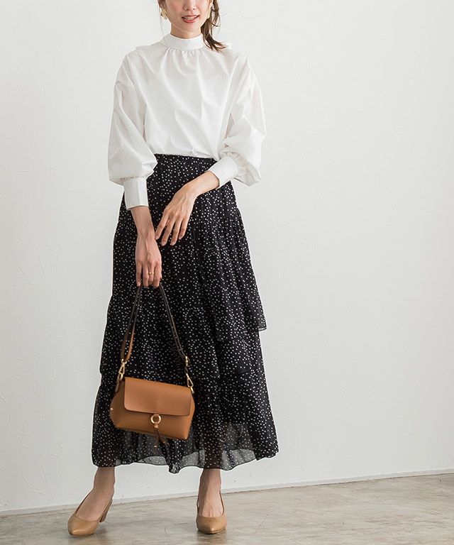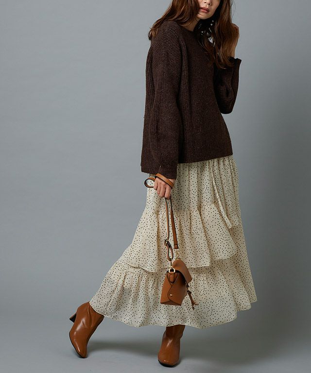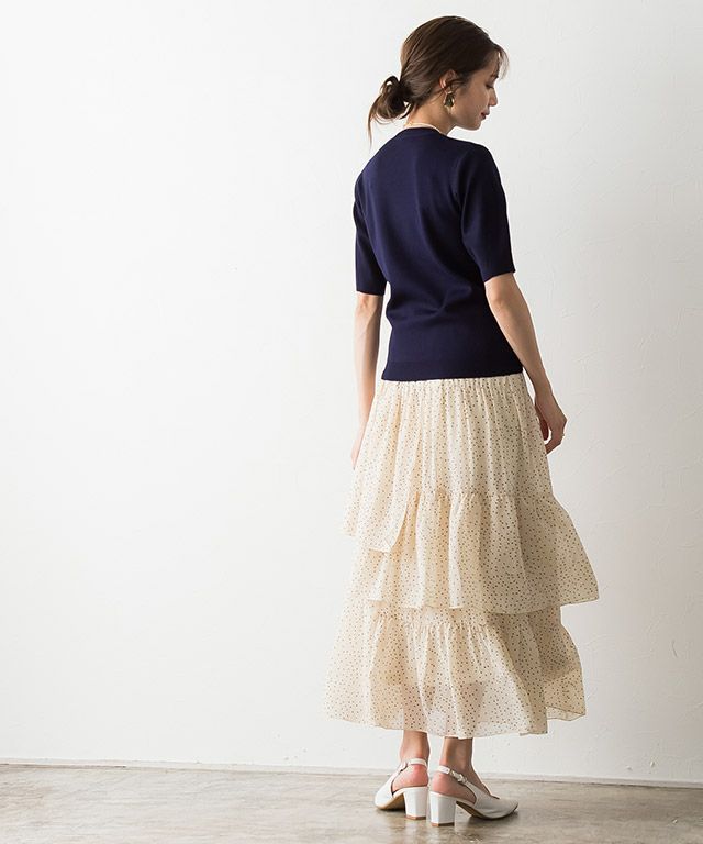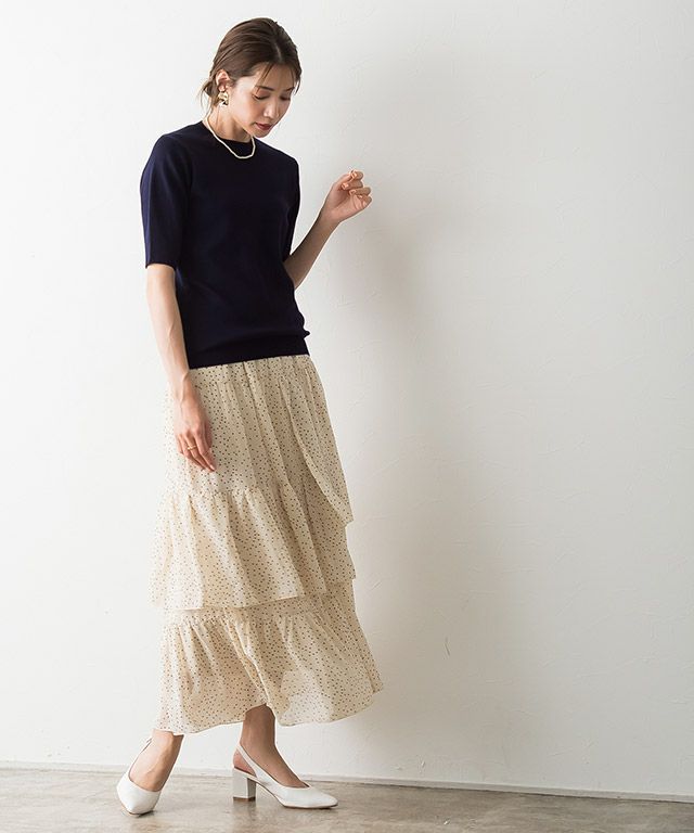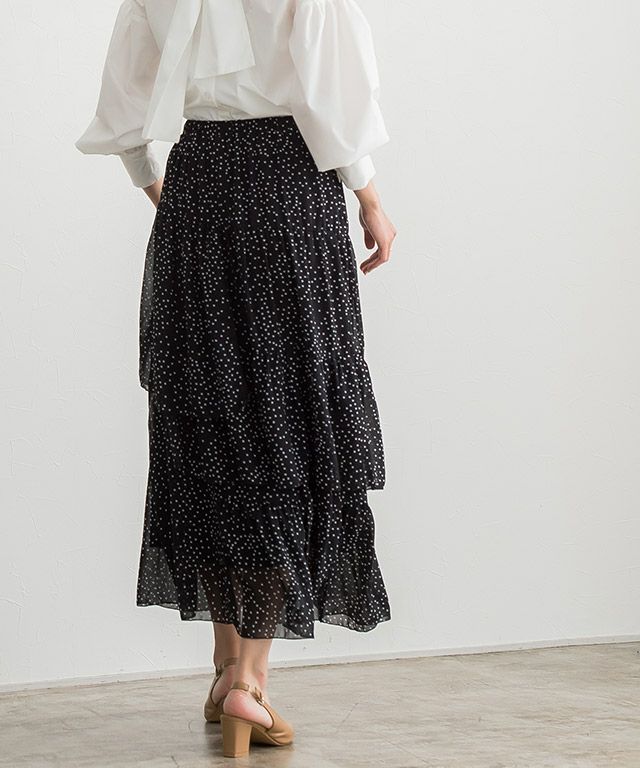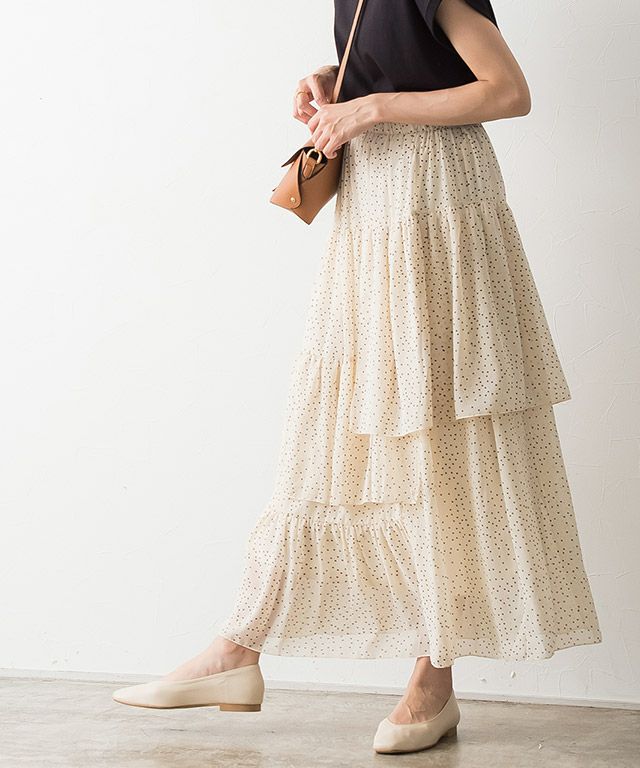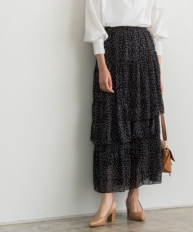 スタイリングに華やかさをプラス“ランダムティアードドットスカート”軽やかなシフォン素材。柔らかく落ち感のある風合いが女性らしさを漂わせます。繊細なギャザーとランダムなフリルが魅力的なスカート。小さいドット柄なのでコーディネートの程よいアクセントに◎デザイン性の高いスカートなので、コーディネートに華やかさをプラスし、鮮度のある着こなしを叶えます。【ブランド】Pierrot(ピエロ)