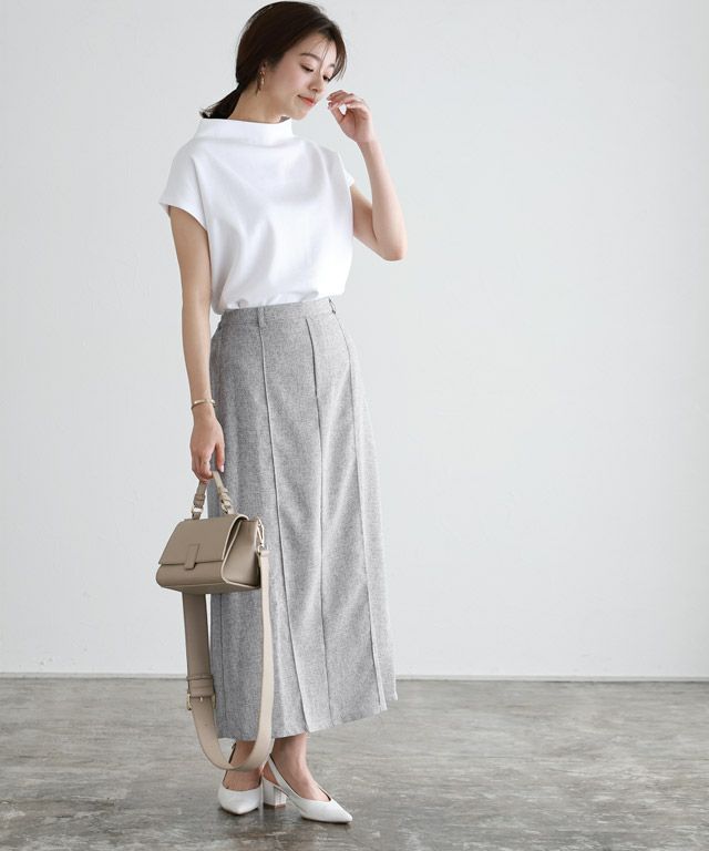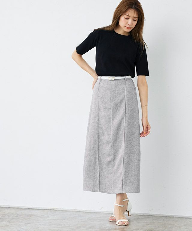 フロントの切り替えラインとピンタックが縦ラインを強調してくれ、すっきり見えするロングスカート。体のラインを拾わない落ち着いたIラインシルエットで、トップスを選ばず合わせやすいデザインに。合わせ方次第でON/OFF着回せるところも嬉しいポイントです。