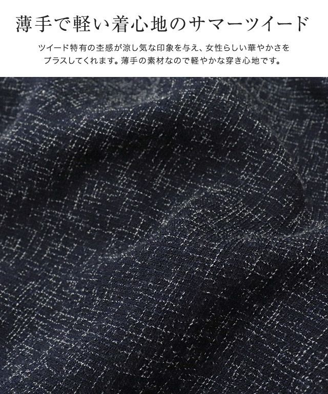 ツイード特有の杢感が涼し気な印象を与え、女性らしい華やかさをプラスしてくれます。薄手の素材なので軽やかな穿き心地です。